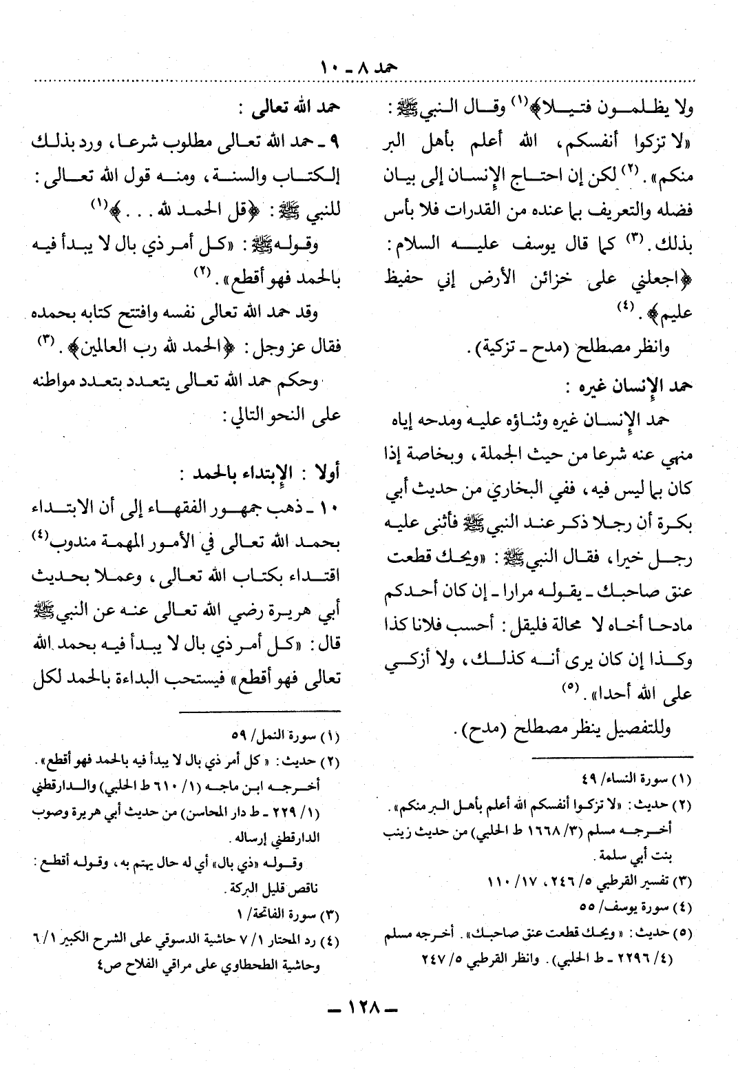 9 - حَمْدُ اللَّهِ تَعَالَى مَطْلُوبٌ شَرَعَا، وَرَدَ بِذَلِكَ الْكِتَابُ وَالسُّنَّةُ، وَمِنْهُ قَوْل اللَّهِ تَعَالَى: لِلنَّبِيِّ صَلَّى اللَّهُ عَلَيْهِ وَسَلَّمَ: {قُل الْحَمْدُ لِلَّهِ} (1) وَقَوْلُهُ صَلَّى اللَّهُ عَلَيْهِ وَسَلَّمَ: كُل أَمْرٍ ذِي بَالٍ لاَ يُبْدَأُ فِيهِ بِالْحَمْدِ فَهُوَ أَقْطَعُ. (2)