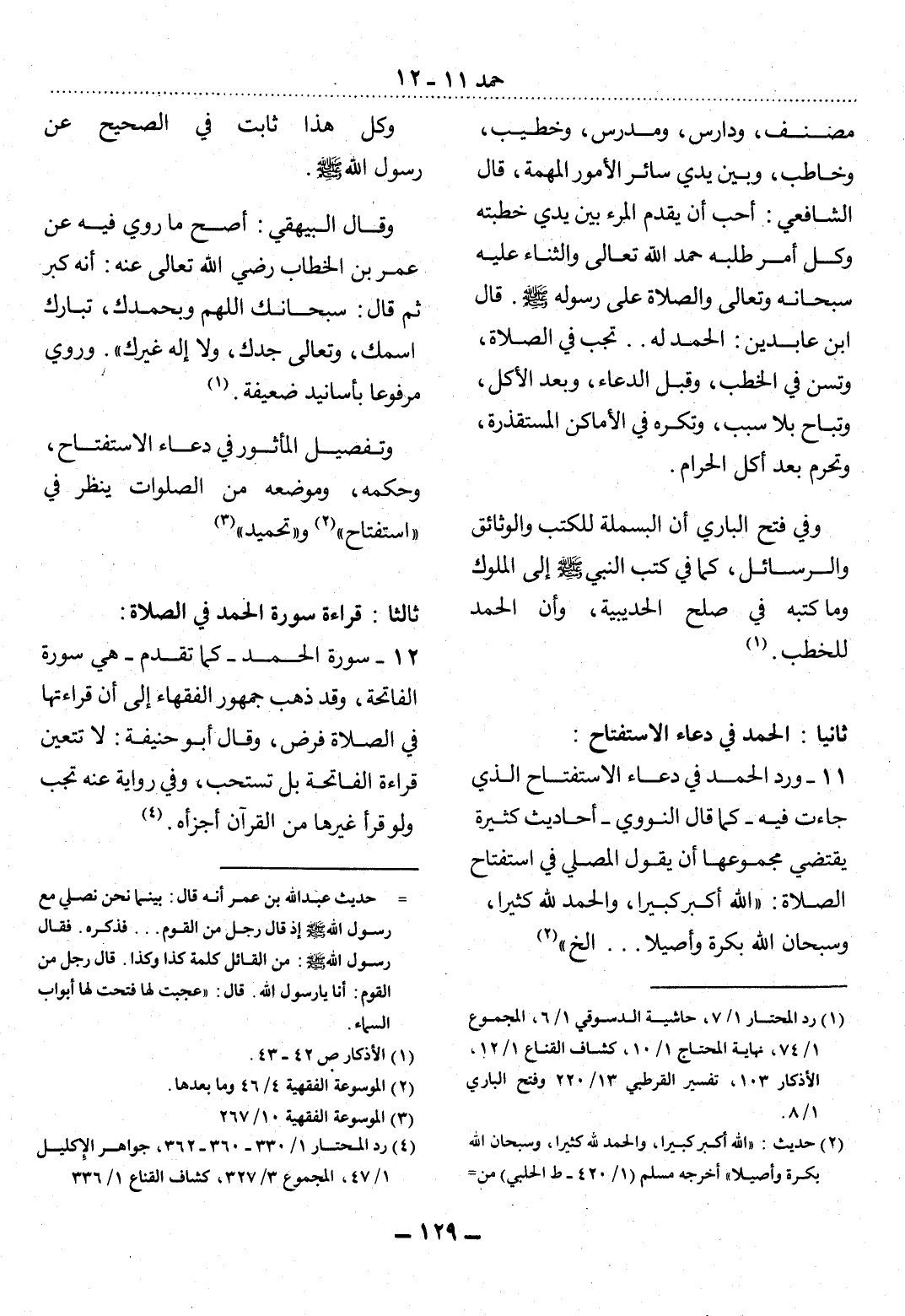11 - وَرَدَ الْحَمْدُ فِي دُعَاءِ الاِسْتِفْتَاحِ الَّذِي جَاءَتْ فِيهِ - كَمَا قَال النَّوَوِيُّ - أَحَادِيثُ كَثِيرَةٌ يَقْتَضِي مَجْمُوعُهَا أَنْ يَقُول الْمُصَلِّي فِي اسْتِفْتَاحِ الصَّلاَةِ: اللَّهُ أَكْبَرُ كَبِيرًا، وَالْحَمْدُ لِلَّهِ كَثِيرًا، وَسُبْحَانَ اللَّهِ بُكْرَةً وَأَصِيلاً. إِلَخْ " (2)