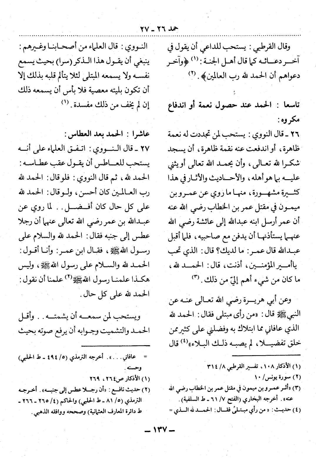 26 - قَال النَّوَوِيُّ: يُسْتَحَبُّ لِمَنْ تَجَدَّدَتْ لَهُ نِعْمَةٌ ظَاهِرَةٌ، أَوِ انْدَفَعَتْ عَنْهُ نِقْمَةٌ ظَاهِرَةٌ، أَنْ يَسْجُدَ شُكْرًا لِلَّهِ تَعَالَى، وَأَنْ يَحْمَدَ اللَّهَ تَعَالَى أَوْ يُثْنِيَ عَلَيْهِ بِمَا هُوَ أَهْلُهُ، وَالأَْحَادِيثُ وَالآْثَارُ فِي هَذَا كَثِيرَةٌ مَشْهُورَةٌ، مِنْهَا مَا رُوِيَ عَنْ عَمْرِو بْنِ مَيْمُونٍ فِي مَقْتَل عُمَرَ بْنِ الْخَطَّابِ رَضِيَ اللَّهُ عَنْهُ أَنَّ عُمَرَ أَرْسَل ابْنَهُ عَبْدَ اللَّهِ إِلَى عَائِشَةَ رَضِيَ اللَّهُ عَنْهُمَا يَسْتَأْذِنُهَا أَنْ يُدْفَنَ مَعَ صَاحِبَيْهِ، فَلَمَّا أَقْبَل عَبْدُ اللَّهِ قَال عُمَرُ: مَا لَدَيْكَ؟ قَال: الَّذِي تُحِبُّ يَا أَمِيرَ الْمُؤْمِنِينَ، أَذِنَتْ، قَال: الْحَمْدُ لِلَّهِ، مَا كَانَ مِنْ شَيْءٍ أَهَمَّ إِلَيَّ مِنْ ذَلِكَ. (3)