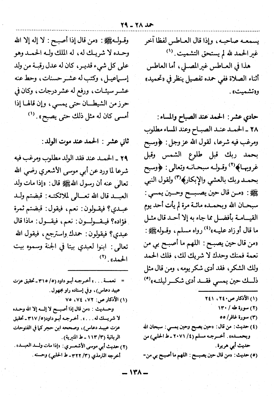 28 - الْحَمْدُ عِنْدَ الصَّبَاحِ وَعِنْدَ الْمَسَاءِ مَطْلُوبٌ وَمُرَغَّبٌ فِيهِ شَرْعًا، لِقَوْل اللَّهِ عَزَّ وَجَل: {وَسَبِّحْ بِحَمْدِ رَبِّكَ قَبْل طُلُوعِ الشَّمْسِ وَقَبْل غُرُوبِهَا} (2) وَقَوْلِهِ سُبْحَانَهُ وَتَعَالَى: {وَسَبِّحْ بِحَمْدِ رَبِّكَ بِالْعَشِيِّ وَالإِْبْكَارِ} (3) وَلِقَوْل النَّبِيِّ صَلَّى اللَّهُ عَلَيْهِ وَسَلَّمَ: مَنْ قَال حِينَ يُصْبِحُ وَحِينَ يُمْسِي: سُبْحَانَ اللَّهِ وَبِحَمْدِهِ مِائَةَ مُرَّةٍ لَمْ يَأْتِ أَحَدٌ يَوْمَ الْقِيَامَةِ بِأَفْضَل مِمَّا جَاءَ بِهِ إِلاَّ أَحَدٌ قَال مِثْل مَا قَال أَوْ زَادَ عَلَيْهِ (4) رَوَاهُ مُسْلِمٌ، وَقَوْلُهُ صَلَّى اللَّهُ عَلَيْهِ وَسَلَّمَ: مَنْ قَال حِينَ يُصْبِحُ: اللَّهُمَّ مَا أَصْبَحَ بِي مِنْ نِعْمَةٍ فَمِنْكَ وَحْدَكَ لاَ شَرِيكَ لَكَ، فَلَكَ الْحَمْدُ وَلَكَ الشُّكْرُ، فَقَدْ أَدَّى شُكْرَ يَوْمِهِ، وَمَنْ قَال مِثْل ذَلِكَ حِينَ يُمْسِي فَقَدْ أَدَّى شُكْرَ لَيْلَتِهِ (5)