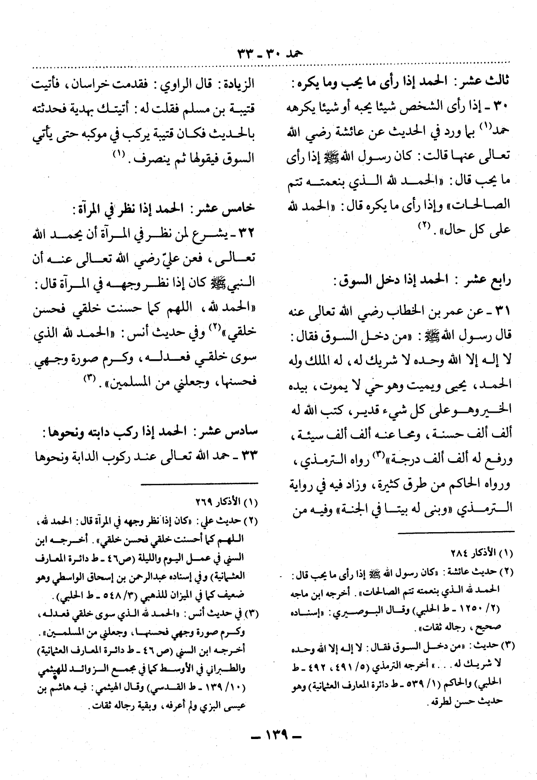 30 - إِذَا رَأَى الشَّخْصُ شَيْئًا يُحِبُّهُ أَوْ شَيْئًا يَكْرَهُهُ حَمِدَ (1) بِمَا وَرَدَ فِي الْحَدِيثِ عَنْ عَائِشَةَ رَضِيَ اللَّهُ تَعَالَى عَنْهَا قَالَتْ: كَانَ رَسُول اللَّهِ صَلَّى اللَّهُ عَلَيْهِ وَسَلَّمَ إِذَا رَأَى مَا يُحِبُّ قَال: الْحَمْدُ لِلَّهِ الَّذِي بِنِعْمَتِهِ تَتِمُّ الصَّالِحَاتُ وَإِذَا رَأَى مَا يَكْرَهُ قَال: الْحَمْدُ لِلَّهِ عَلَى كُل حَالٍ. (2)