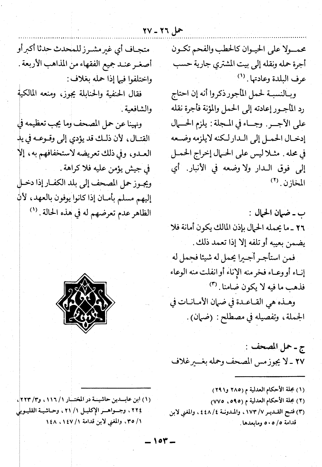 26 - مَا يَحْمِلُهُ الْحَمَّال بِإِذْنِ الْمَالِكِ يَكُونُ أَمَانَةً فَلاَ يَضْمَنُ بِعَيْبِهِ أَوْ تَلَفِهِ إِلاَّ إِذَا تَعَمَّدَ ذَلِكَ. فَمَنِ اسْتَأْجَرَ أَجِيرًا يَحْمِل لَهُ شَيْئًا فَحَمَل لَهُ إِنَاءً أَوْ وِعَاءً فَخَرَّ مِنْهُ الإِْنَاءُ أَوِ انْفَلَتَ مِنْهُ الْوِعَاءُ فَذَهَبَ مَا فِيهِ لاَ يَكُونُ ضَامِنًا. (3)