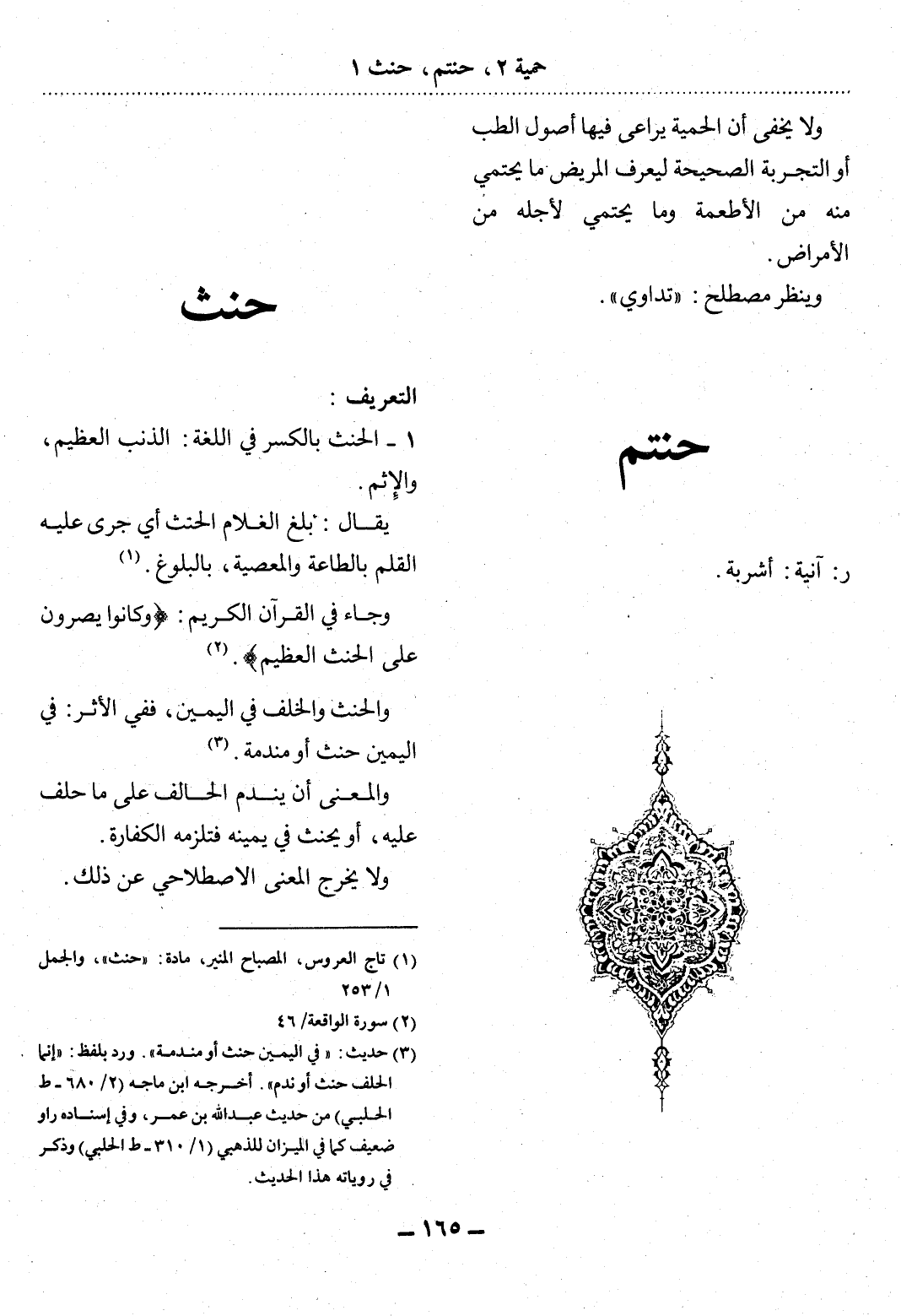 (1) تاج العروس، المصباح المنير، مادة: " حنث "، والجمل 1 / 253.