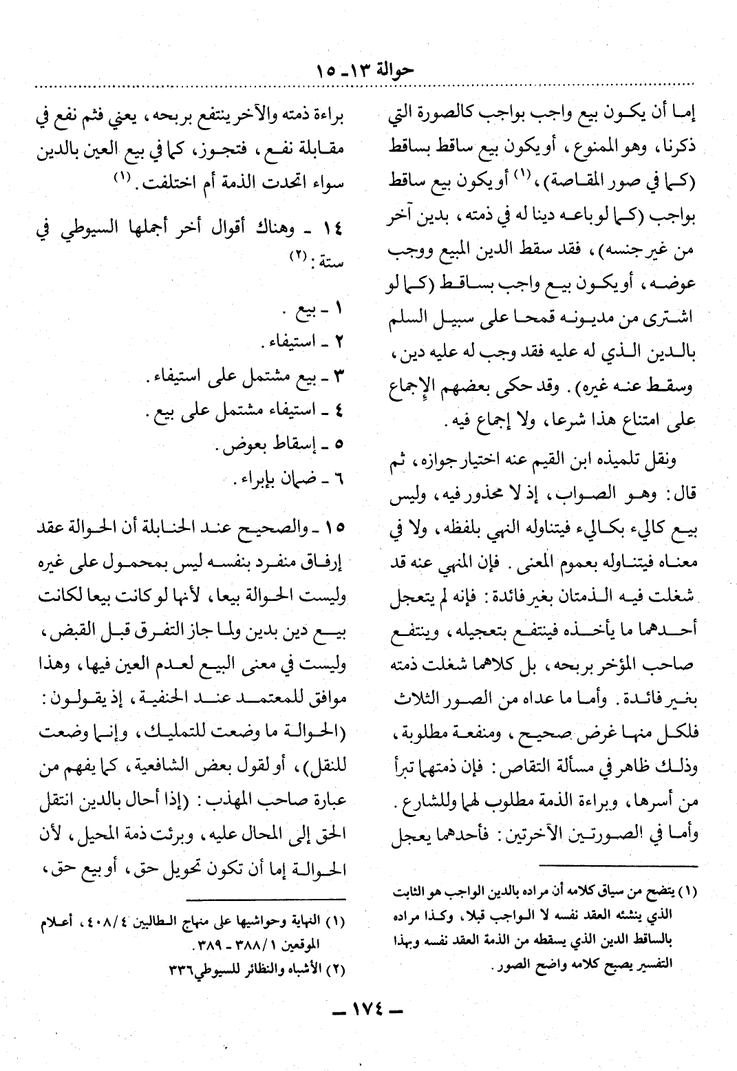 (1) يتضح من سياق كلامه أن مراده بالدين الواجب هو الثابت الذي ينشئه العقد نفسه لا الواجب قبلا، وكذا مراده بالساقط الدين الذي يسقطه من الذمة العقد نفسه وبهذا التفسير يصبح كلامه واضح الصور.