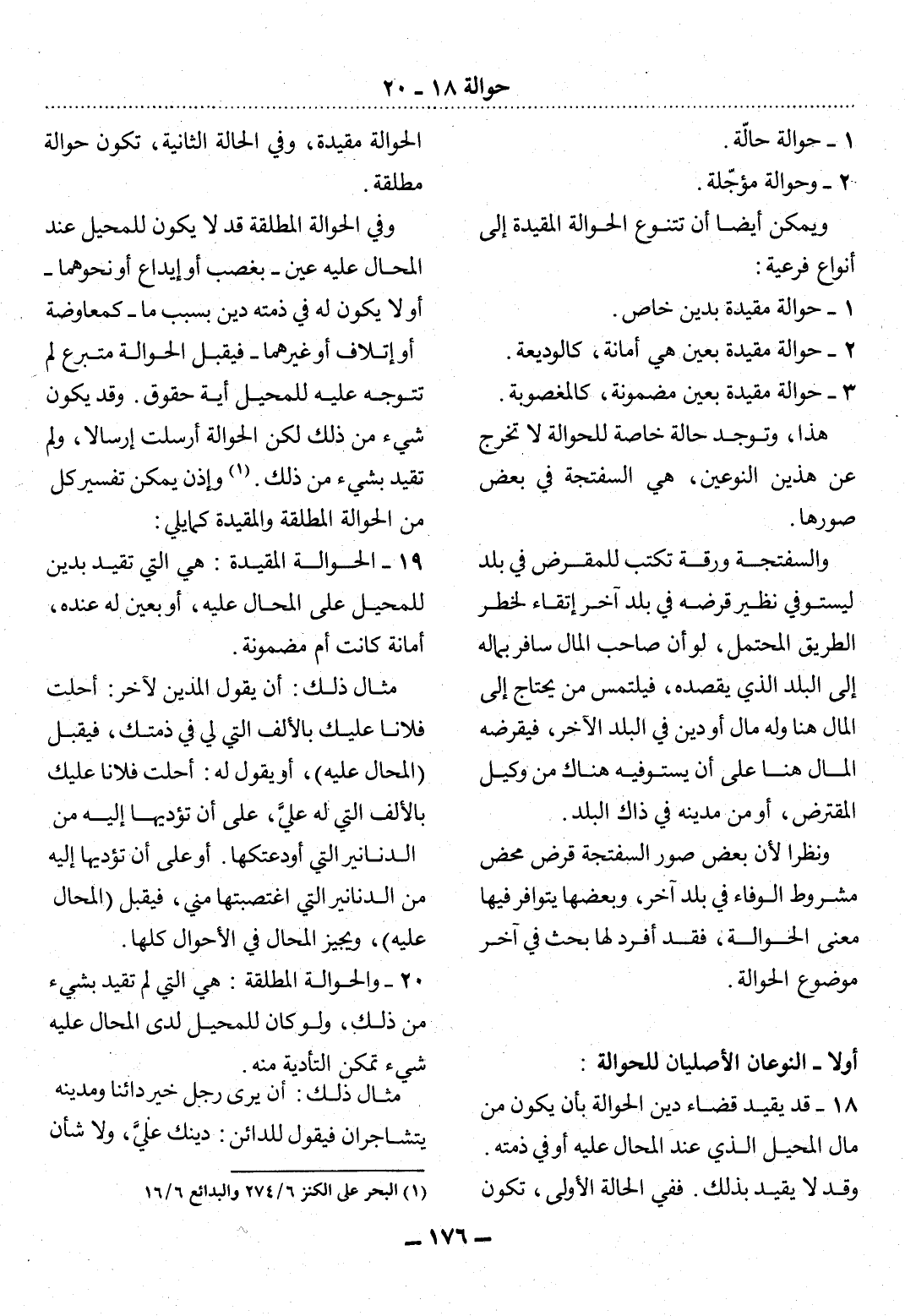 19 - الْحَوَالَةُ الْمُقَيَّدَةُ: هِيَ الَّتِي تُقَيَّدُ بِدَيْنٍ لِلْمُحِيل عَلَى الْمُحَال عَلَيْهِ، أَوْ بِعَيْنٍ لَهُ عِنْدَهُ، أَمَانَةً كَانَتْ أَمْ مَضْمُونَةً.