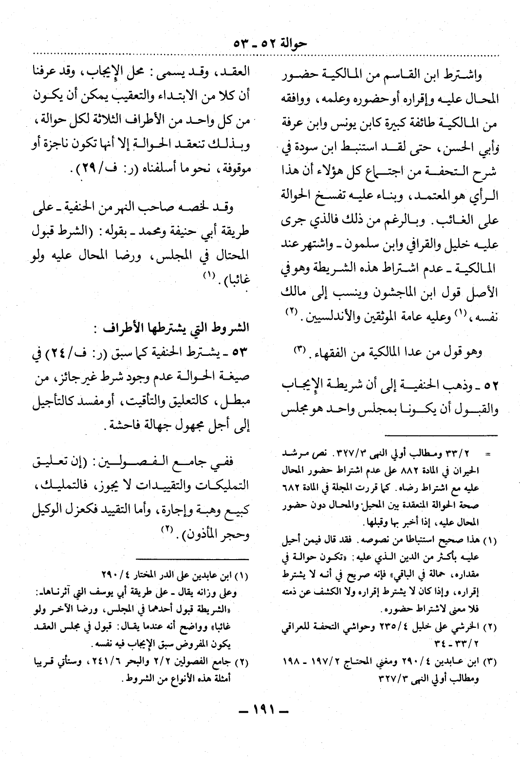 53 - يَشْتَرِطُ الْحَنَفِيَّةُ كَمَا سَبَقَ (ر: ف 24) فِي صِيغَةِ الْحَوَالَةِ عَدَمَ وُجُودِ شَرْطٍ غَيْرِ جَائِزٍ، مِنْ مُبْطِلٍ، كَالتَّعْلِيقِ وَالتَّأْقِيتِ، أَوْ مُفْسِدٍ كَالتَّأْجِيل إِلَى أَجَلٍ مَجْهُولٍ جَهَالَةً فَاحِشَةً.