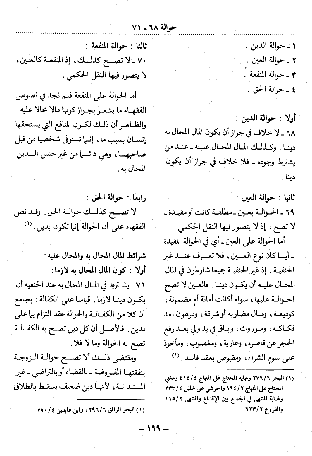 68 - لاَ خِلاَفَ فِي جَوَازِ أَنْ يَكُونَ الْمَال الْمُحَال بِهِ دَيْنًا. وَكَذَلِكَ الْمَال الْمُحَال عَلَيْهِ - عِنْدَ مَنْ يَشْتَرِطُ وُجُودَهُ - فَلاَ خِلاَفَ فِي جَوَازِ أَنْ يَكُونَ دَيْنًا.