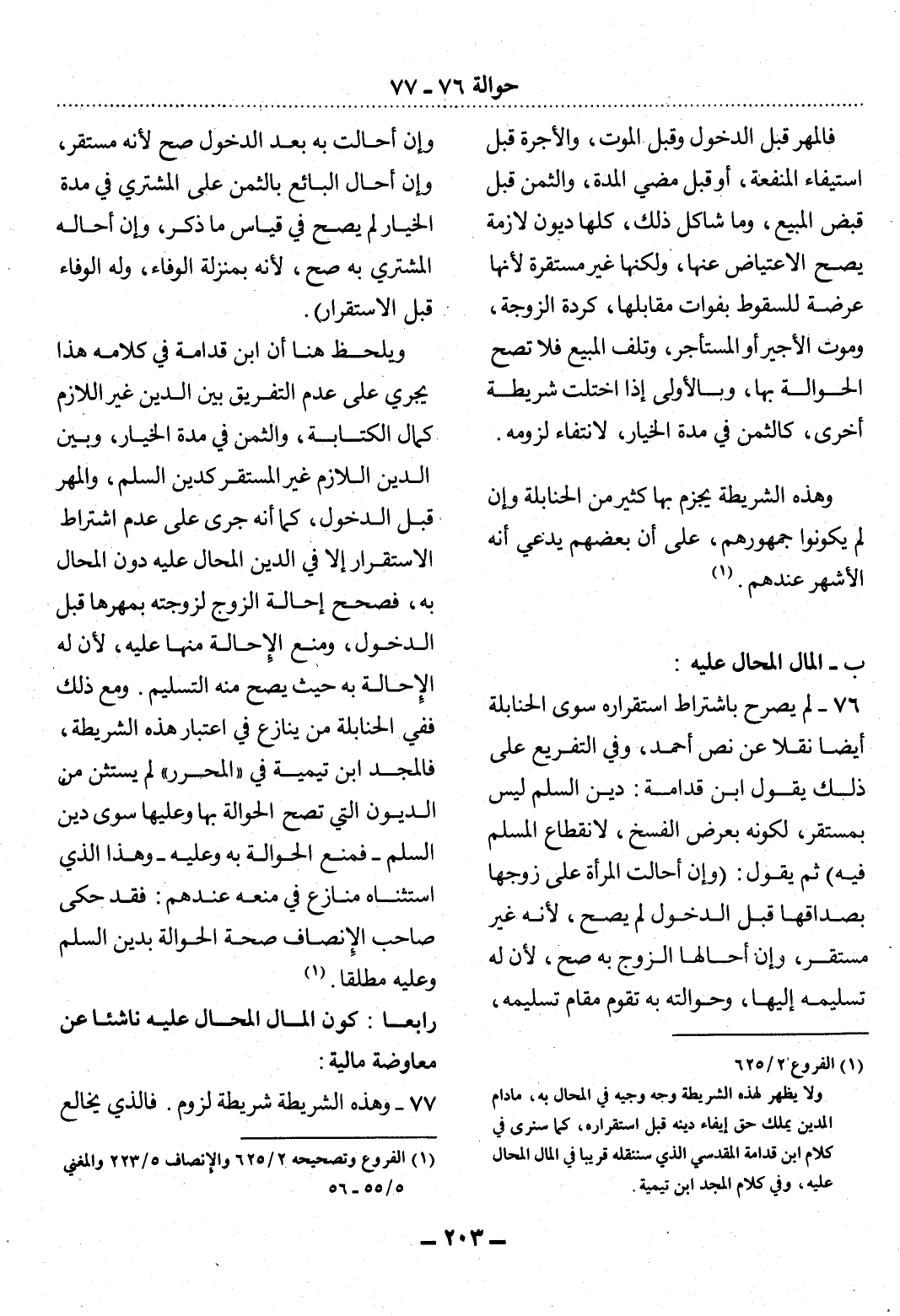 (1) الفروع 2 / 625. ولا يظهر لهذه الشريطة وجه وجيه في المحال به، مادام المدين يملك حق إيفاء دينه قبل استقراره، كما سنرى في كلام ابن قدامة المقدسي الذي سننقله قريبا في المال المحال عليه، وفي كلام المجد ابن تيمية.