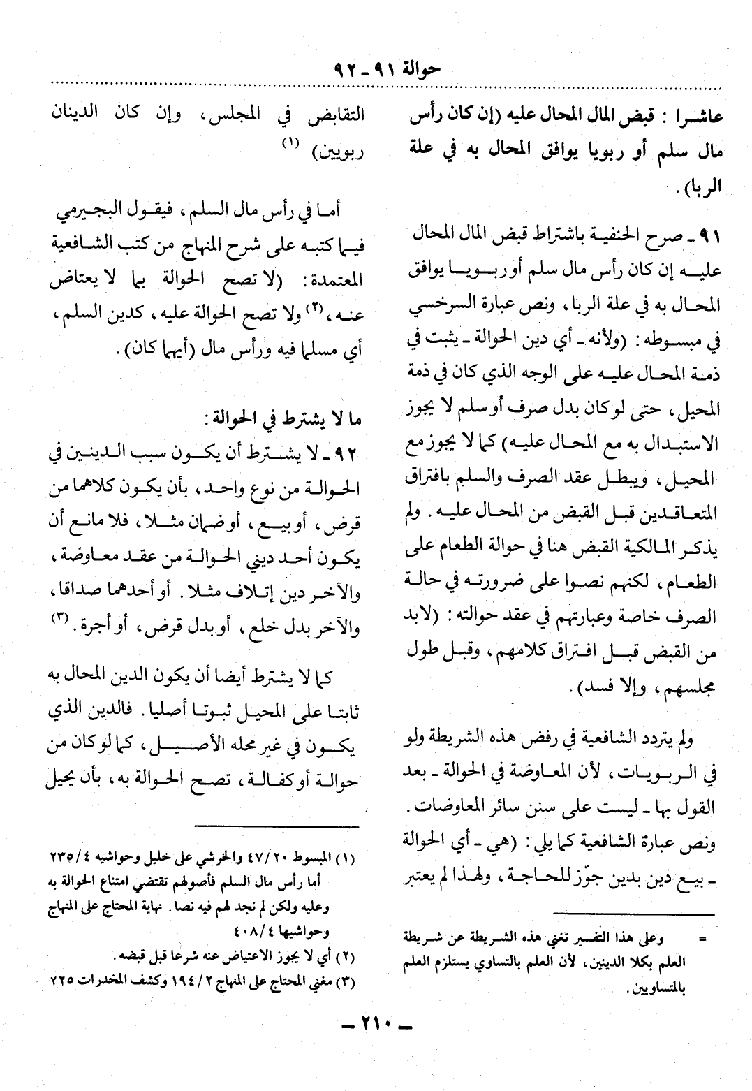 92 - لاَ يُشْتَرَطُ أَنْ يَكُونَ سَبَبُ الدَّيْنَيْنِ فِي الْحَوَالَةِ مِنْ نَوْعٍ وَاحِدٍ، بِأَنْ يَكُونَ كِلاَهُمَا مِنْ قَرْضٍ، أَوْ بَيْعٍ، أَوْ ضَمَانٍ مَثَلاً، فَلاَ مَانِعَ أَنْ يَكُونَ أَحَدُ دَيْنَيِ الْحَوَالَةِ مِنْ عَقْدِ مُعَاوَضَةٍ، وَالآْخَرُ دَيْنَ إِتْلاَفٍ مَثَلاً. أَوْ أَحَدُهُمَا صَدَاقًا، وَالآْخَرُ بَدَل خُلْعٍ، أَوْ بَدَل قَرْضٍ، أَوْ أُجْرَةٍ. (3)