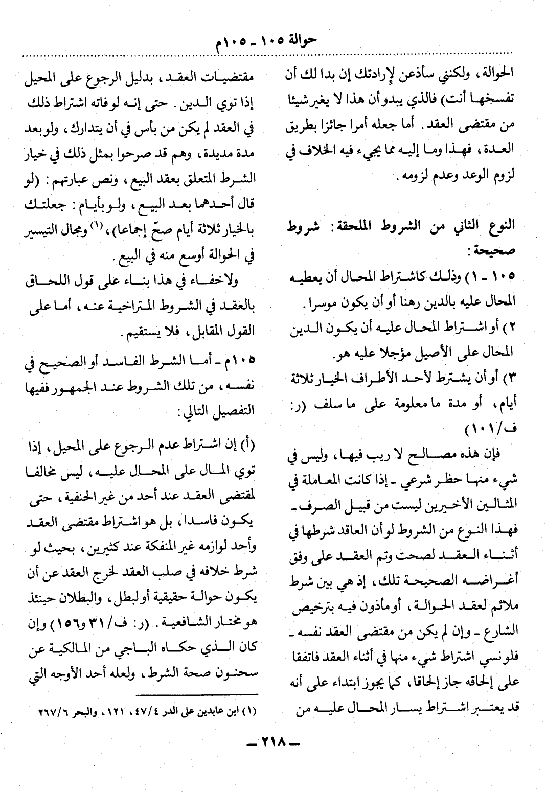 105 - (1) وَذَلِكَ كَاشْتِرَاطِ الْمُحَال أَنْ يُعْطِيَهُ الْمُحَال عَلَيْهِ بِالدَّيْنِ رَهْنًا أَوْ أَنْ يَكُونَ مُوسِرًا.