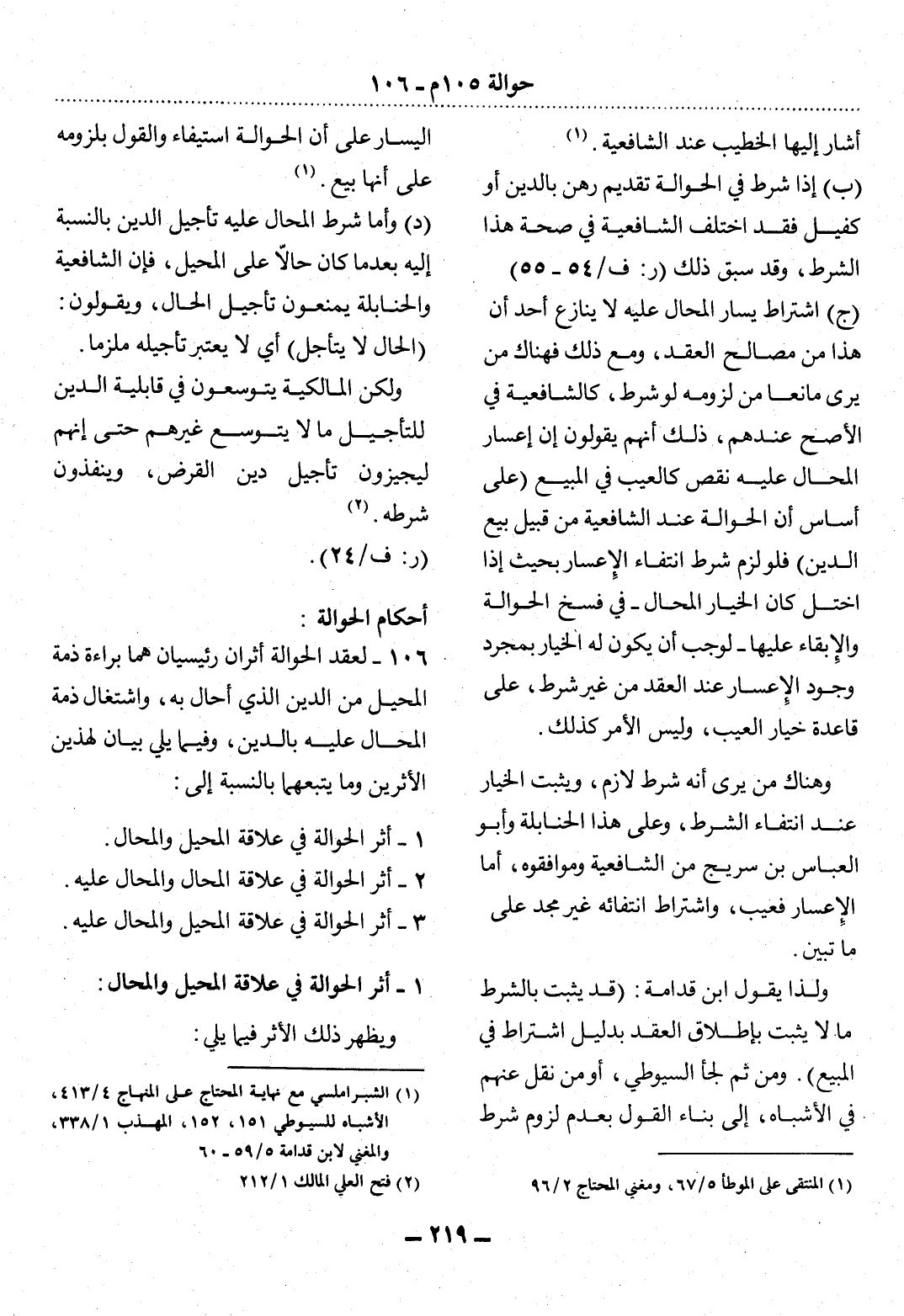 106 - لِعَقْدِ الْحَوَالَةِ أَثَرَانِ رَئِيسِيَّانِ هُمَا بَرَاءَةُ ذِمَّةِ الْمُحِيل مِنَ الدَّيْنِ الَّذِي أَحَال بِهِ، وَاشْتِغَال ذِمَّةِ الْمُحَال عَلَيْهِ بِالدَّيْنِ، وَفِيمَا يَلِي بَيَانٌ لِهَذَيْنِ الأَْثَرَيْنِ وَمَا يَتْبَعُهُمَا بِالنِّسْبَةِ إِلَى: