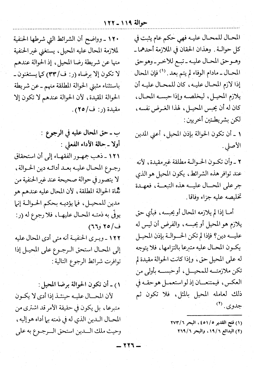 121 - ذَهَبَ جُمْهُورُ الْفُقَهَاءِ إِلَى أَنَّ اسْتِحْقَاقَ رُجُوعِ الْمُحَال عَلَيْهِ بَعْدَ أَدَائِهِ دَيْنَ الْحَوَالَةِ، لاَ يُتَصَوَّرُ فِي حَوَالَةٍ صَحِيحَةٍ عِنْدَ غَيْرِ الْحَنَفِيَّةِ مِنْ نُفَاةِ الْحَوَالَةِ الْمُطْلَقَةِ، لأَِنَّ الْمُحَال عَلَيْهِ عِنْدَهُمْ هُوَ مَدِينٌ لِلْمُحِيل، فَمَا يُؤَدِّيهِ بِحُكْمِ الْحَوَالَةِ إِنَّمَا يُوَفِّي بِهِ ذِمَّتَهُ الْمُحَال عَلَيْهَا، فَلاَ رُجُوعَ لَهُ (ر: ف 25 و 66)