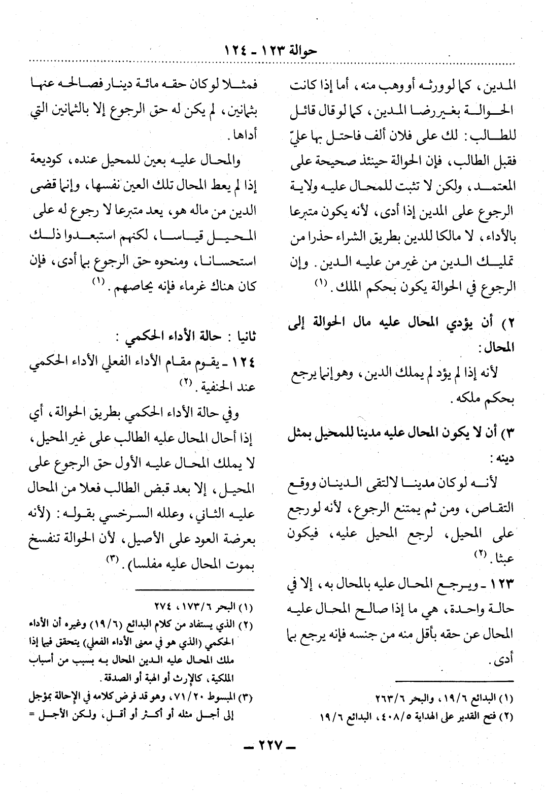 (2) الذي يستفاد من كلام البدائع (6 / 19) وغيره أن الأداء الحكمي (الذي هو في معنى الأداء الفعلي) يتحقق فيما إذا ملك المحال عليه الدين المحال بسبب من أسباب الملكية، كالإرث أو الهبة أو الصدقة.