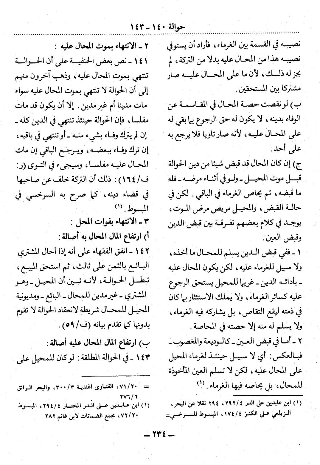 141 - نَصَّ بَعْضُ الْحَنَفِيَّةِ عَلَى أَنَّ الْحَوَالَةَ تَنْتَهِي بِمَوْتِ الْمُحَال عَلَيْهِ، وَذَهَبَ آخَرُونَ مِنْهُمْ إِلَى أَنَّ الْحَوَالَةَ لاَ تَنْتَهِي بِمَوْتِ الْمُحَال عَلَيْهِ سَوَاءٌ مَاتَ مَدِينًا أَمْ غَيْرَ مَدِينٍ. إِلاَّ أَنْ يَكُونَ قَدْ مَاتَ مُفْلِسًا، فَإِنَّ الْحَوَالَةَ حِينَئِذٍ تَنْتَهِي فِي الدَّيْنِ كُلِّهِ - إِنْ لَمْ يَتْرُكْ وَفَاءً بِشَيْءٍ مِنْهُ - أَوْ تَنْتَهِيَ فِي بَاقِيهِ، إِنْ تَرَكَ وَفَاءً بِبَعْضِهِ، وَيَرْجِعُ الْبَاقِي إِنْ مَاتَ الْمُحَال عَلَيْهِ مُفْلِسًا، وَسَيَجِيءُ فِي التَّوَى (ر: ف 164) : ذَلِكَ أَنَّ التَّرِكَةَ خَلَفٌ عَنْ صَاحِبِهَا فِي قَضَاءِ دَيْنِهِ، كَمَا صَرَّحَ بِهِ السَّرَخْسِيُّ فِي الْمَبْسُوطِ. (1)