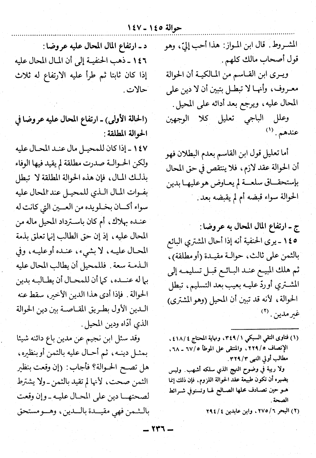 (1) فتاوى التقي السبكي 1 / 349، ونهاية المحتاج 4 / 418، الإنصاف 5 / 229، والمنتقى على الموطأ 5 / 67 - 68، مطالب أولي النهى 3 / 329. ولا ريبة في وضوح النهج الذي سلكه أشهب. وليس يضيره أن تكون طبيعة عقد الحوالة اللزوم، فإن ذلك إنما هو حين تصادف محلها الصالح لها وتستوفي شرائط الصحة.