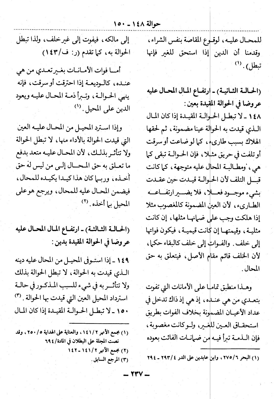 149 - إِذَا اسْتَوْفَى الْمُحِيل مِنَ الْمُحَال عَلَيْهِ دَيْنَهُ الَّذِي قُيِّدَتْ بِهِ الْحَوَالَةُ، لاَ تَبْطُل الْحَوَالَةُ بِذَلِكَ وَلاَ تَتَأَثَّرُ بِهِ فِي شَيْءٍ لِلسَّبَبِ الْمَذْكُورِ فِي حَالَةِ اسْتِرْدَادِ الْمُحِيل الْعَيْنَ الَّتِي قُيِّدَتْ بِهَا الْحَوَالَةُ. (3)