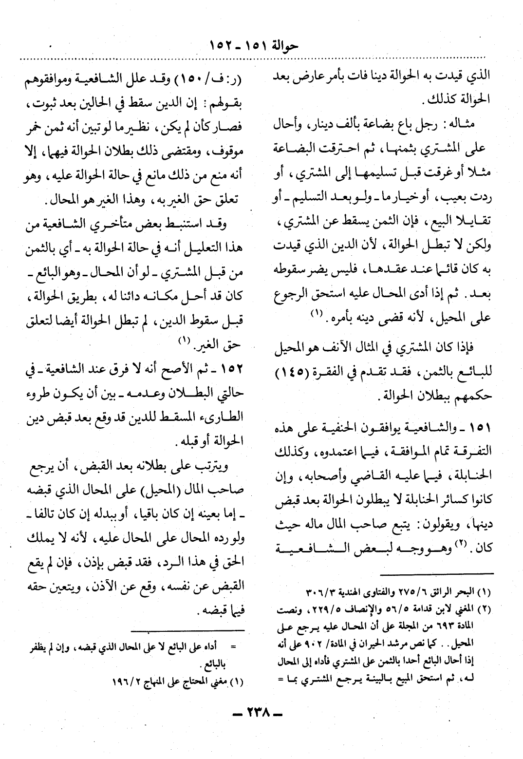 151 - وَالشَّافِعِيَّةُ يُوَافِقُونَ الْحَنَفِيَّةَ عَلَى هَذِهِ التَّفْرِقَةِ تَمَامَ الْمُوَافَقَةِ، فِيمَا اعْتَمَدُوهُ، وَكَذَلِكَ الْحَنَابِلَةُ، فِيمَا عَلَيْهِ الْقَاضِي وَأَصْحَابُهُ، وَإِنْ كَانُوا كَسَائِرِ الْحَنَابِلَةِ لاَ يُبْطِلُونَ الْحَوَالَةَ بَعْدَ قَبْضِ دَيْنِهَا، وَيَقُولُونَ: يَتْبَعُ صَاحِبُ الْمَال مَالَهُ حَيْثُ كَانَ. (2) وَهُوَ وَجْهٌ لِبَعْضِ الشَّافِعِيَّةِ