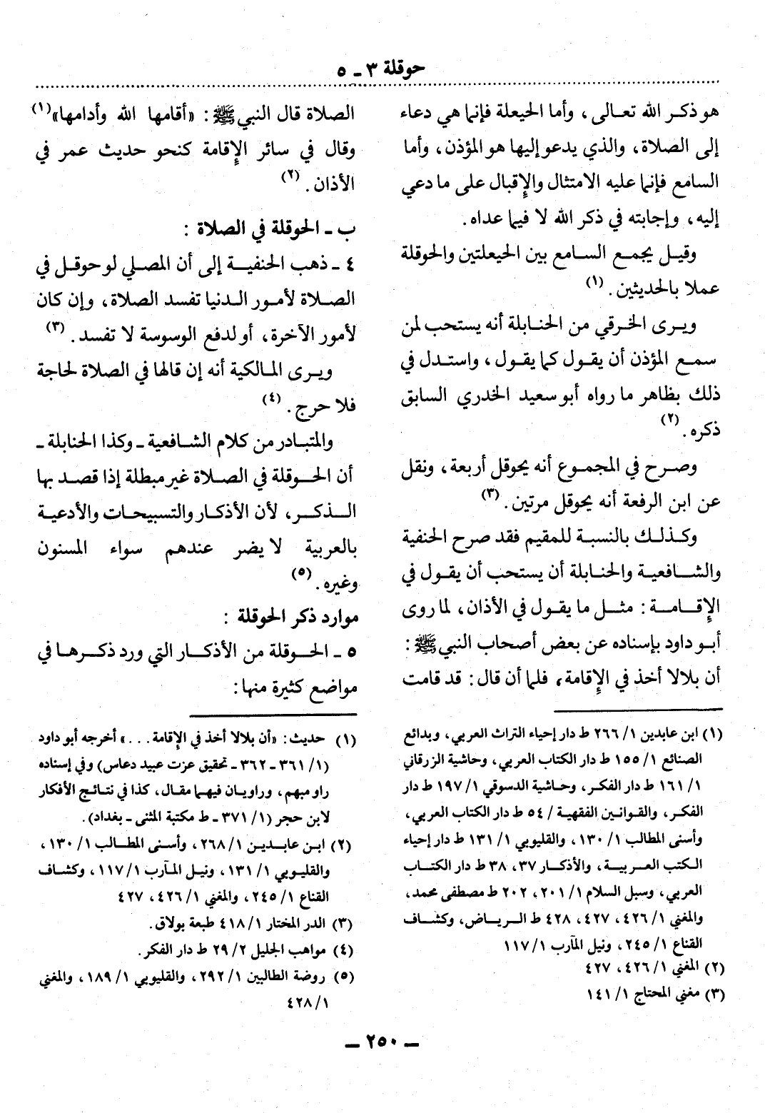 4 - ذَهَبَ الْحَنَفِيَّةُ إِلَى أَنَّ الْمُصَلِّيَ لَوْ حَوْقَل فِي الصَّلاَةِ لأُِمُورِ الدُّنْيَا تَفْسُدُ الصَّلاَةُ، وَإِنْ كَانَ لأُِمُورِ الآْخِرَةِ، أَوْ لِدَفْعِ الْوَسْوَسَةِ لاَ تَفْسُدُ. (3) وَيَرَى الْمَالِكِيَّةُ أَنَّهُ إِنْ قَالَهَا فِي الصَّلاَةِ لِحَاجَةٍ فَلاَ حَرَجَ. (4)