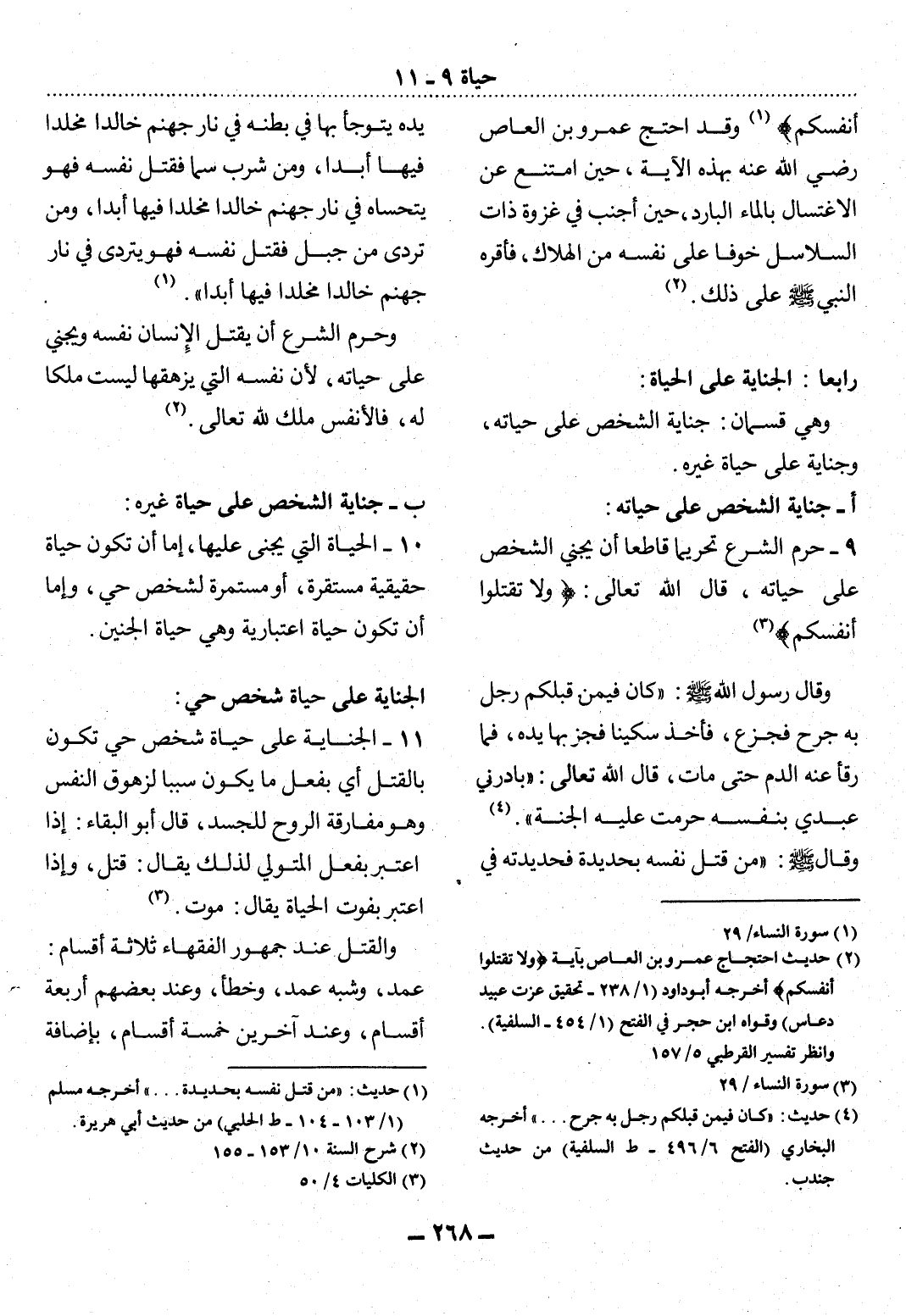 9 - حَرَّمَ الشَّرْعُ تَحْرِيمًا قَاطِعًا أَنْ يَجْنِيَ الشَّخْصُ عَلَى حَيَاتِهِ، قَال اللَّهُ تَعَالَى: {وَلاَ تَقْتُلُوا أَنْفُسَكُمْ} (3)