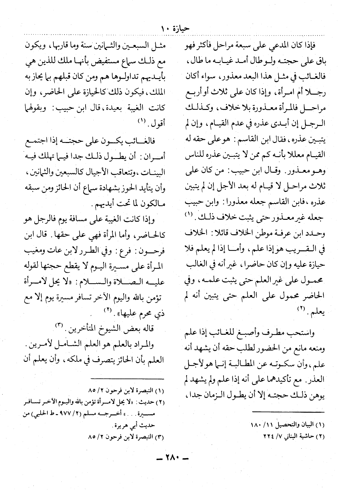وَإِذَا كَانَتِ الْغَيْبَةُ عَلَى مَسَافَةِ يَوْمٍ فَالرَّجُل هُوَ كَالْحَاضِرِ، وَأَمَّا الْمَرْأَةُ فَهِيَ عَلَى حَقِّهَا. قَال ابْنُ فَرْحُونَ: فَرْعٌ: وَفِي الطُّرُرِ لاِبْنِ عَاتٍ وَمَغِيبُ الْمَرْأَةِ عَلَى مَسِيرَةِ الْيَوْمِ لاَ يَقْطَعُ حُجَّتَهَا لِقَوْلِهِ عَلَيْهِ الصَّلَاةُ وَالسَّلَامُ: لاَ يَحِل لاِمْرَأَةٍ تُؤْمِنُ بِاللَّهِ وَالْيَوْمِ الآْخِرِ تُسَافِرُ مَسِيرَةَ يَوْمٍ إِلاَّ مَعَ ذِي مَحْرَمٍ عَلَيْهَا. (2)