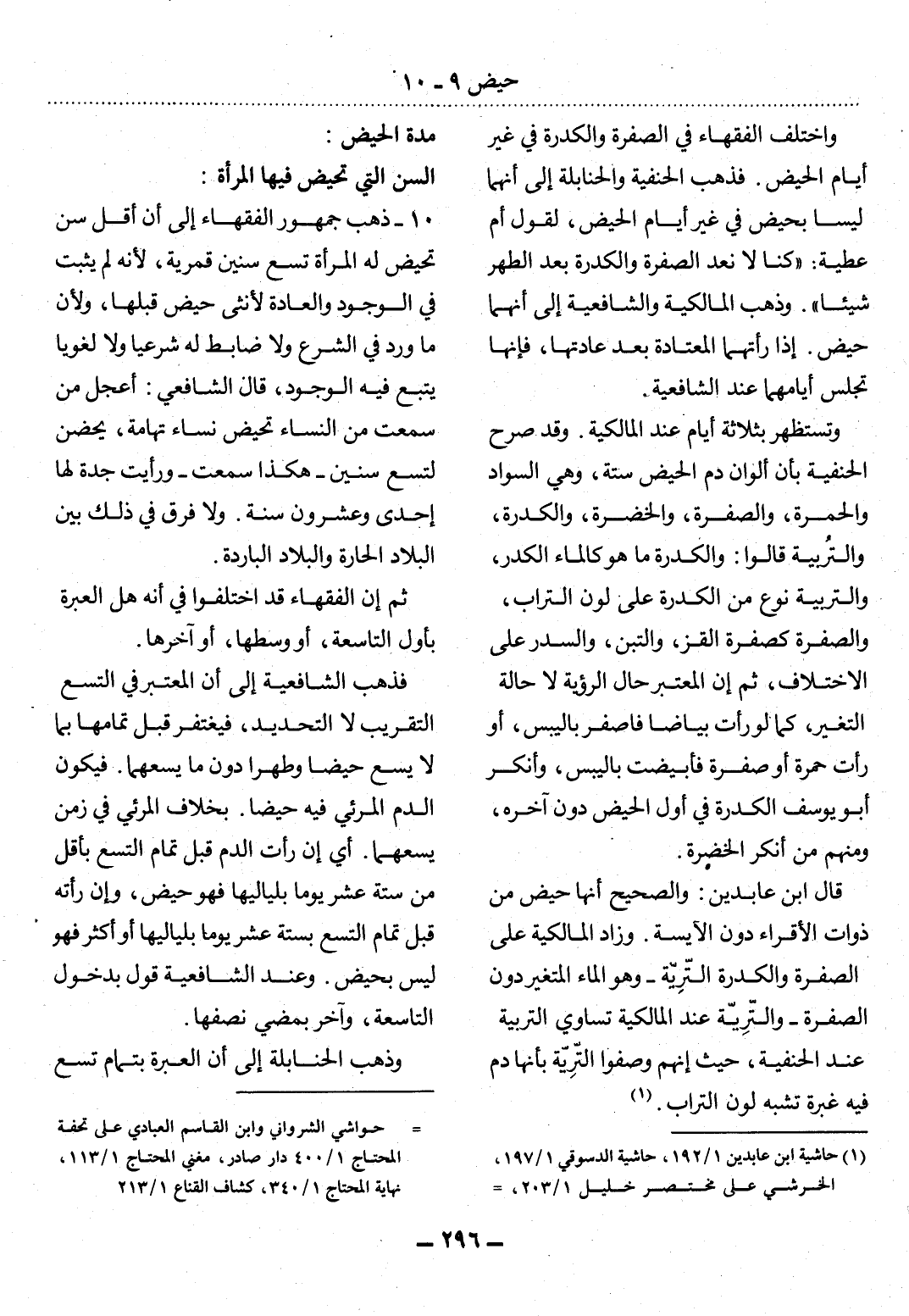 10 - ذَهَبَ جُمْهُورُ الْفُقَهَاءِ إِلَى أَنَّ أَقَلّ سِنٍّ تَحِيضُ لَهُ الْمَرْأَةُ تِسْعُ سِنِينَ قَمَرِيَّةٍ، لأَِنَّهُ لَمْ يَثْبُتْ فِي الْوُجُودِ وَالْعَادَةِ لأُِنْثَى حَيْضٌ قَبْلَهَا، وَلأَِنَّ مَا وَرَدَ فِي الشَّرْعِ وَلاَ ضَابِطَ لَهُ شَرْعِيًّا وَلاَ لُغَوِيًّا يُتْبَعُ فِيهِ الْوُجُودُ، قَال الشَّافِعِيُّ: أَعْجَل مَنْ سَمِعْتُ مِنَ النِّسَاءِ تَحِيضُ نِسَاءُ تِهَامَةَ، يَحِضْنَ لِتِسْعِ سِنِينَ - هَكَذَا سَمِعْتُ - وَرَأَيْتُ جَدَّةً لَهَا إِحْدَى وَعِشْرُونَ سَنَةً. وَلاَ فَرْقَ فِي ذَلِكَ بَيْنَ الْبِلاَدِ الْحَارَّةِ وَالْبِلاَدِ الْبَارِدَةِ.
