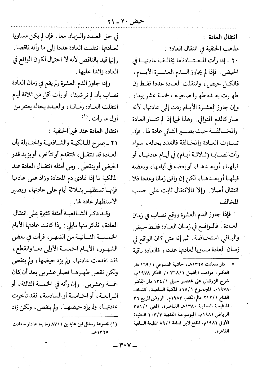 20 - إِذَا رَأَتِ الْمُعْتَادَةُ مَا يُخَالِفُ عَادَتَهَا فِي الْحَيْضِ. فَإِذَا لَمْ يُجَاوِزِ الدَّمُ الْعَشَرَةَ الأَْيَّامَ، فَالْكُل حَيْضٌ، وَانْتَقَلَتِ الْعَادَةُ عَدَدًا فَقَطْ إِنْ طَهُرَتْ بَعْدَهُ طُهْرًا صَحِيحًا خَمْسَةَ عَشَرَ يَوْمًا، وَإِنْ جَاوَزَ الْعَشَرَةَ الأَْيَّامَ رُدَّتْ إِلَى عَادَتِهَا، لأَِنَّهُ صَارَ كَالدَّمِ الْمُتَوَالِي. وَهَذَا فِيمَا إِذَا لَمْ تَتَسَاوَ الْعَادَةُ وَالْمُخَالَفَةُ حَيْثُ يَصِيرُ الثَّانِي عَادَةً لَهَا. فَإِنْ تَسَاوَتِ الْعَادَةُ وَالْمُخَالَفَةُ فَالْعَدَدُ بِحَالِهِ، سَوَاءٌ رَأَتْ نِصَابًا (ثَلاَثَةَ أَيَّامٍ) فِي أَيَّامِ عَادَتِهَا، أَوْ قَبْلَهَا، أَوْ بَعْدَهَا، أَوْ بَعْضُهُ فِي أَيَّامِهَا، وَبَعْضُهُ قَبْلَهَا أَوْ بَعْدَهَا، لَكِنْ إِنْ وَافَقَ زَمَانًا وَعَدَدًا فَلاَ انْتِقَال أَصْلاً. وَإِلاَّ فَالاِنْتِقَال ثَابِتٌ عَلَى حَسَبِ الْمُخَالِفِ.