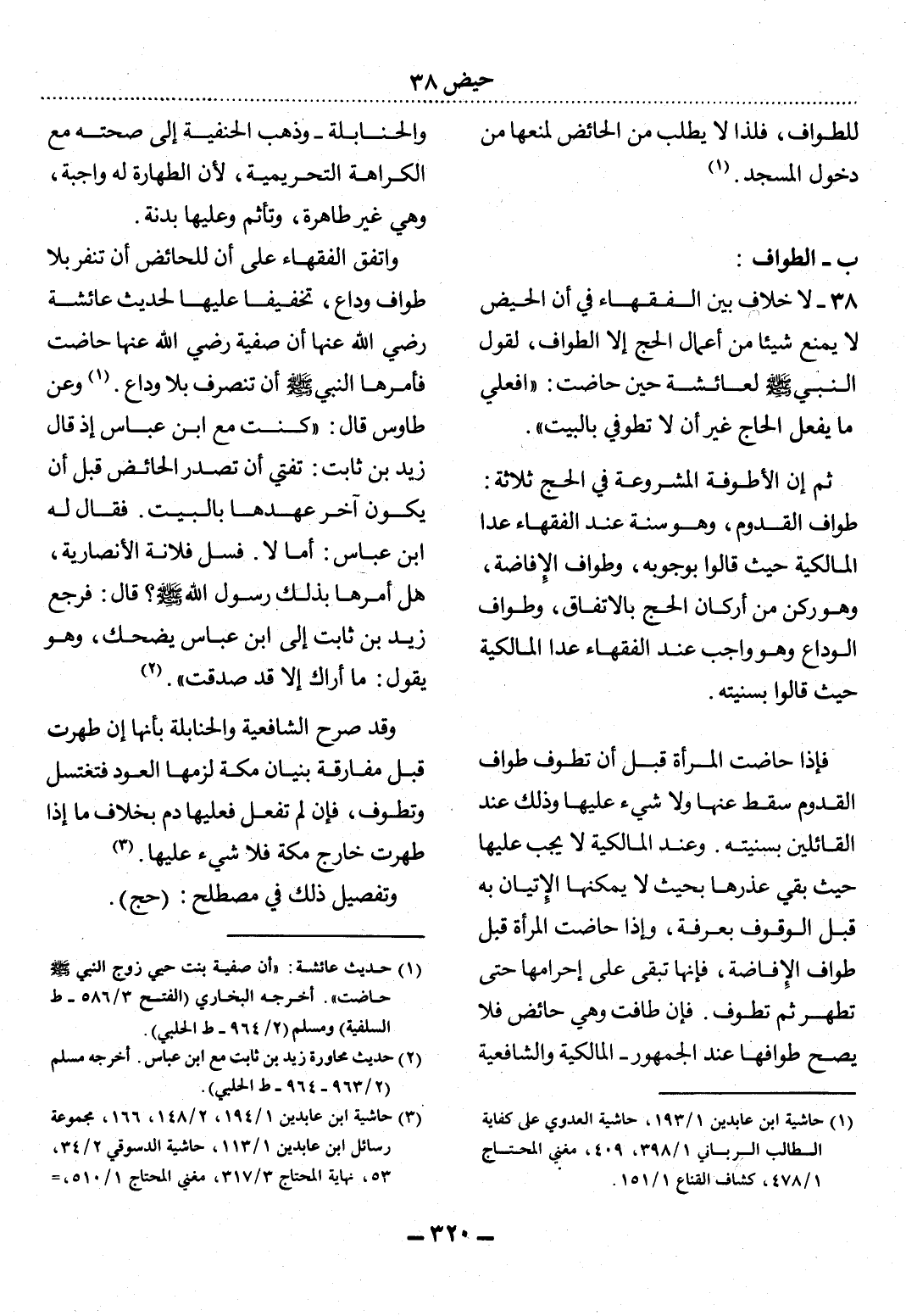 (1) حديث عائشة: " أن صفية بنت حيي زوج النبي صلى الله عليه وسلم حاضت " أخرجه البخاري (الفتح 3 / 586 - ط السلفية) ومسلم (2 / 964 - ط الحلبي) .