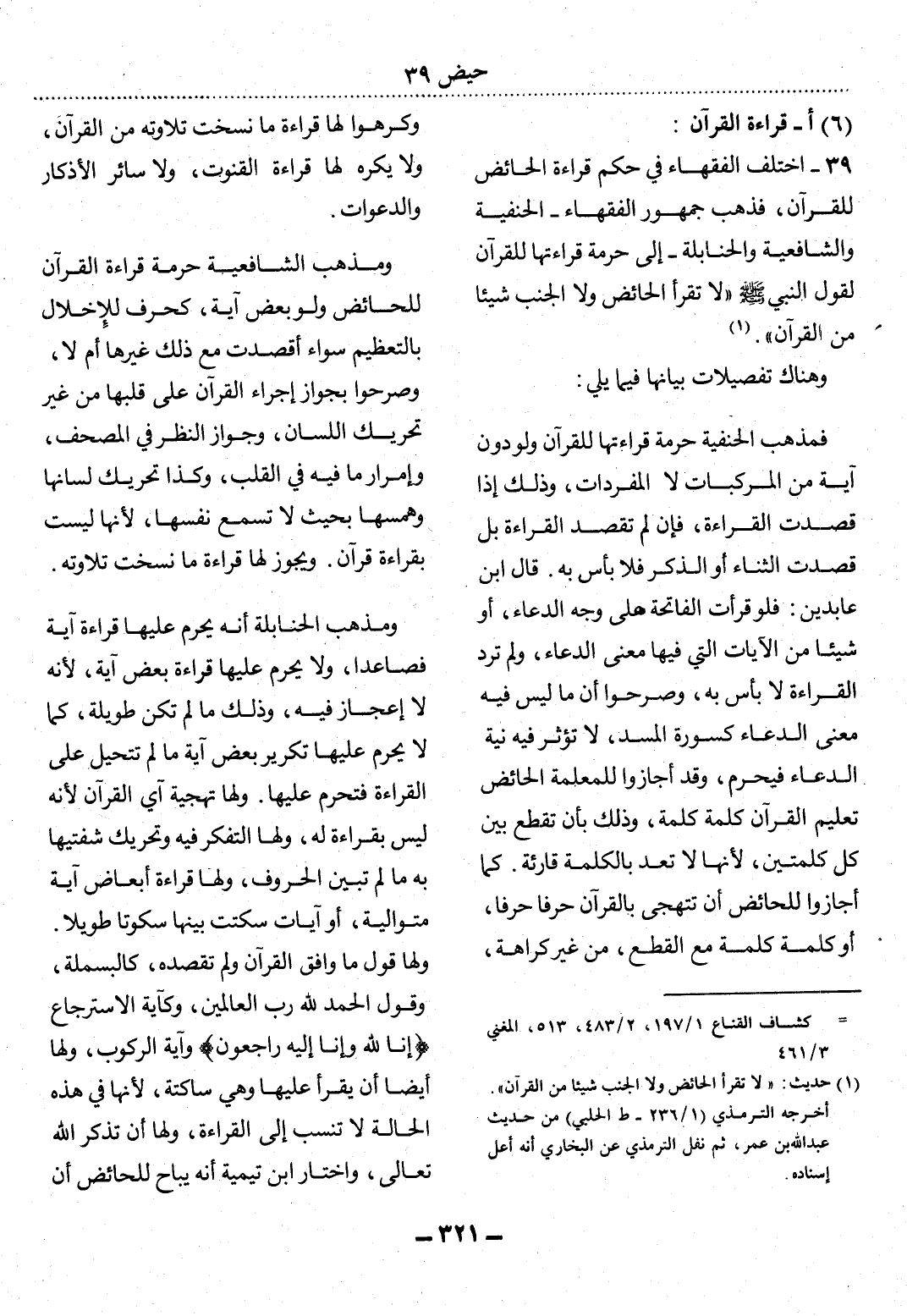 39 - اخْتَلَفَ الْفُقَهَاءُ فِي حُكْمِ قِرَاءَةِ الْحَائِضِ لِلْقُرْآنِ، فَذَهَبَ جُمْهُورُ الْفُقَهَاءِ - الْحَنَفِيَّةُ وَالشَّافِعِيَّةُ وَالْحَنَابِلَةُ - إِلَى حُرْمَةِ قِرَاءَتِهَا لِلْقُرْآنِ لِقَوْل النَّبِيِّ صَلَّى اللَّهُ عَلَيْهِ وَسَلَّمَ لاَ تَقْرَأُ الْحَائِضُ وَلاَ الْجُنُبُ شَيْئًا مِنَ الْقُرْآنِ (1) .