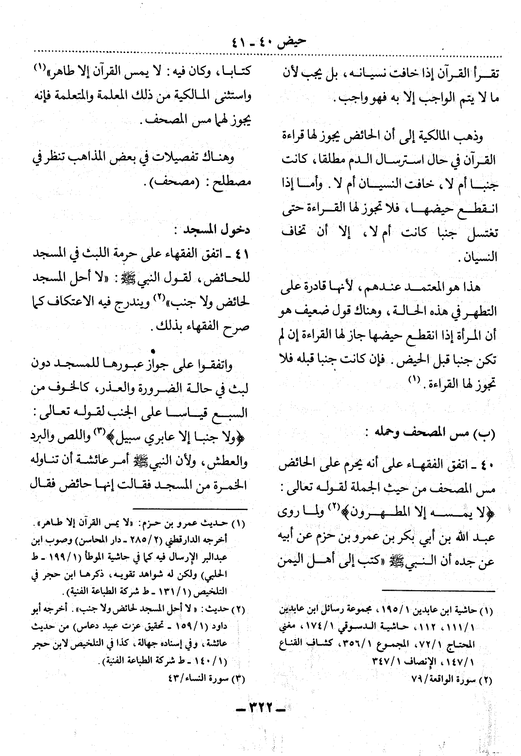 40 - اتَّفَقَ الْفُقَهَاءُ عَلَى أَنَّهُ يَحْرُمُ عَلَى الْحَائِضِ مَسُّ الْمُصْحَفِ مِنْ حَيْثُ الْجُمْلَةُ لِقَوْلِهِ تَعَالَى: {لاَ يَمَسُّهُ إِلاَّ الْمُطَهَّرُونَ} (2) وَلِمَا رَوَى عَبْدُ اللَّهِ بْنُ أَبِي بَكْرِ بْنِ عَمْرِو بْنِ حَزْمٍ عَنْ أَبِيهِ عَنْ جَدِّهِ أَنَّ النَّبِيَّ صَلَّى اللَّهُ عَلَيْهِ وَسَلَّمَ كَتَبَ إِلَى أَهْل الْيَمَنِ