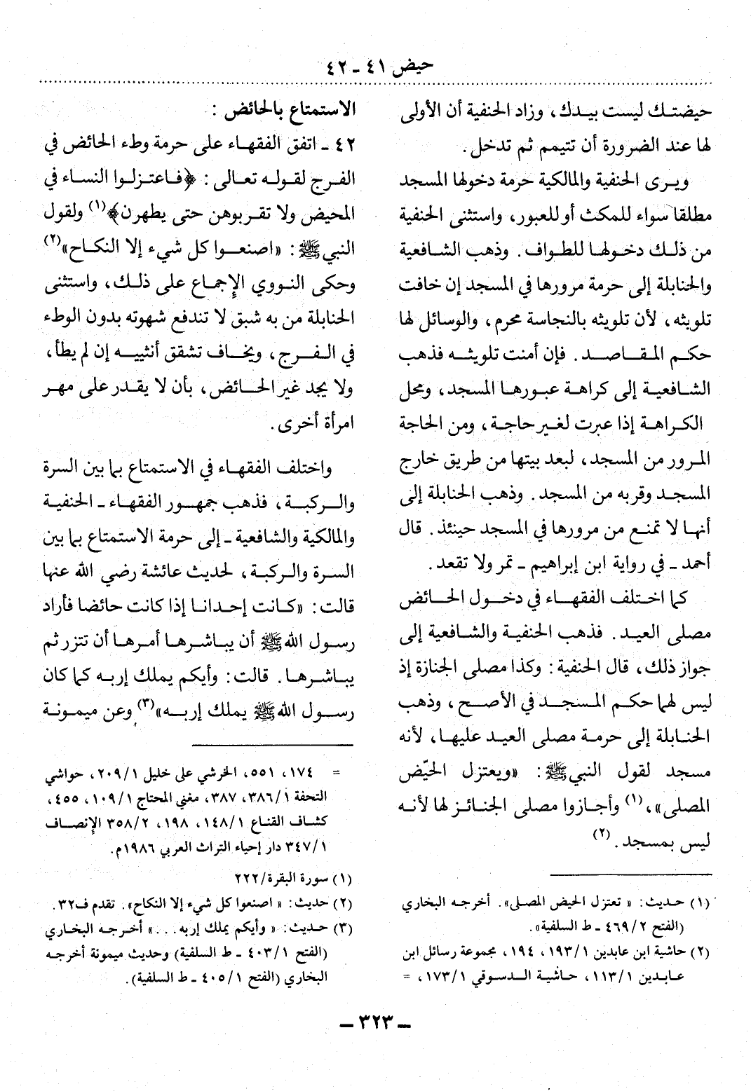 42 - اتَّفَقَ الْفُقَهَاءُ عَلَى حُرْمَةِ وَطْءِ الْحَائِضِ فِي الْفَرَجِ لِقَوْلِهِ تَعَالَى: {فَاعْتَزِلُوا النِّسَاءَ فِي الْمَحِيضِ وَلاَ تَقْرَبُوهُنَّ حَتَّى يَطْهُرْنَ} وَلِقَوْل النَّبِيِّ صَلَّى اللَّهُ عَلَيْهِ وَسَلَّمَ: اصْنَعُوا كُل شَيْءٍ إِلاَّ النِّكَاحَ وَحَكَى النَّوَوِيُّ الإِْجْمَاعَ عَلَى ذَلِكَ، وَاسْتَثْنَى الْحَنَابِلَةُ مَنْ بِهِ شَبَقٌ لاَ تَنْدَفِعُ شَهْوَتُهُ بِدُونِ الْوَطْءِ فِي الْفَرْجِ، وَيَخَافُ تَشَقُّقَ أُنْثَيَيْهِ إِنْ لَمْ يَطَأْ، وَلاَ يَجِدُ غَيْرَ الْحَائِضِ، بِأَنْ لاَ يَقْدِرَ عَلَى مَهْرِ امْرَأَةٍ أُخْرَى.