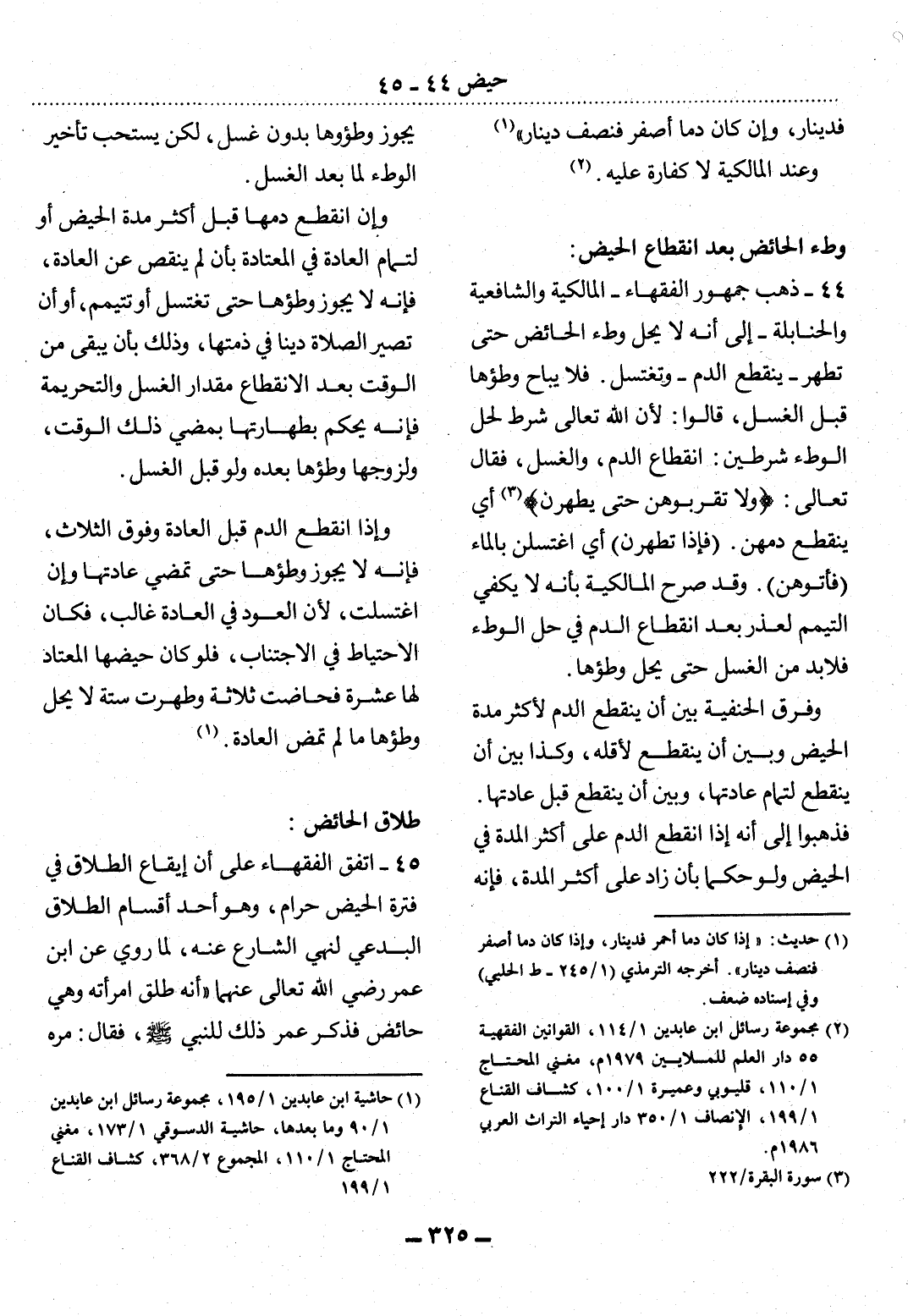 44 - ذَهَبَ جُمْهُورُ الْفُقَهَاءِ - الْمَالِكِيَّةُ وَالشَّافِعِيَّةُ وَالْحَنَابِلَةُ - إِلَى أَنَّهُ لاَ يَحِل وَطْءُ الْحَائِضِ حَتَّى تَطْهُرَ - يَنْقَطِعَ الدَّمُ - وَتَغْتَسِل. فَلاَ يُبَاحُ وَطْؤُهَا قَبْل الْغُسْل، قَالُوا: لأَِنَّ اللَّهَ تَعَالَى شَرَطَ لِحِل الْوَطْءِ شَرْطَيْنِ: انْقِطَاعَ الدَّمِ، وَالْغُسْل، فَقَال تَعَالَى: {وَلاَ تَقْرَبُوهُنَّ حَتَّى يَطْهُرْنَ} أَيْ يَنْقَطِعَ دَمَهُنَّ. {فَإِذَا تَطَهَّرْنَ} أَيِ اغْتَسَلْنَ بِالْمَاءِ {فَأَتَوْهُنَّ} . وَقَدْ صَرَّحَ الْمَالِكِيَّةُ بِأَنَّهُ لاَ يَكْفِي التَّيَمُّمُ لِعُذْرٍ بَعْدَ انْقِطَاعِ الدَّمِ فِي حِل الْوَطْءِ فَلاَ بُدَّ مِنَ الْغُسْل حَتَّى يَحِل وَطْؤُهَا.