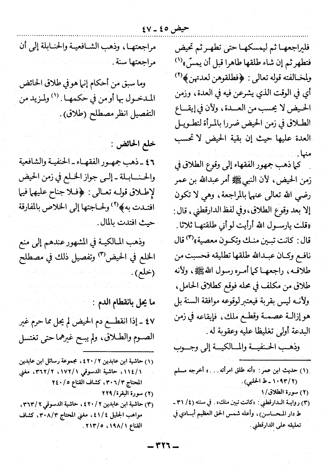 46 - ذَهَبَ جُمْهُورُ الْفُقَهَاءِ - الْحَنَفِيَّةُ وَالشَّافِعِيَّةُ وَالْحَنَابِلَةُ - إِلَى جَوَازِ الْخُلْعِ فِي زَمَنِ الْحَيْضِ لإِِطْلاَقِ قَوْله تَعَالَى: {فَلاَ جُنَاحَ عَلَيْهِمَا فِيمَا افْتَدَتْ بِهِ} وَلِحَاجَتِهَا إِلَى الْخَلاَصِ بِالْمُفَارَقَةِ حَيْثُ افْتَدَتْ بِالْمَال.
