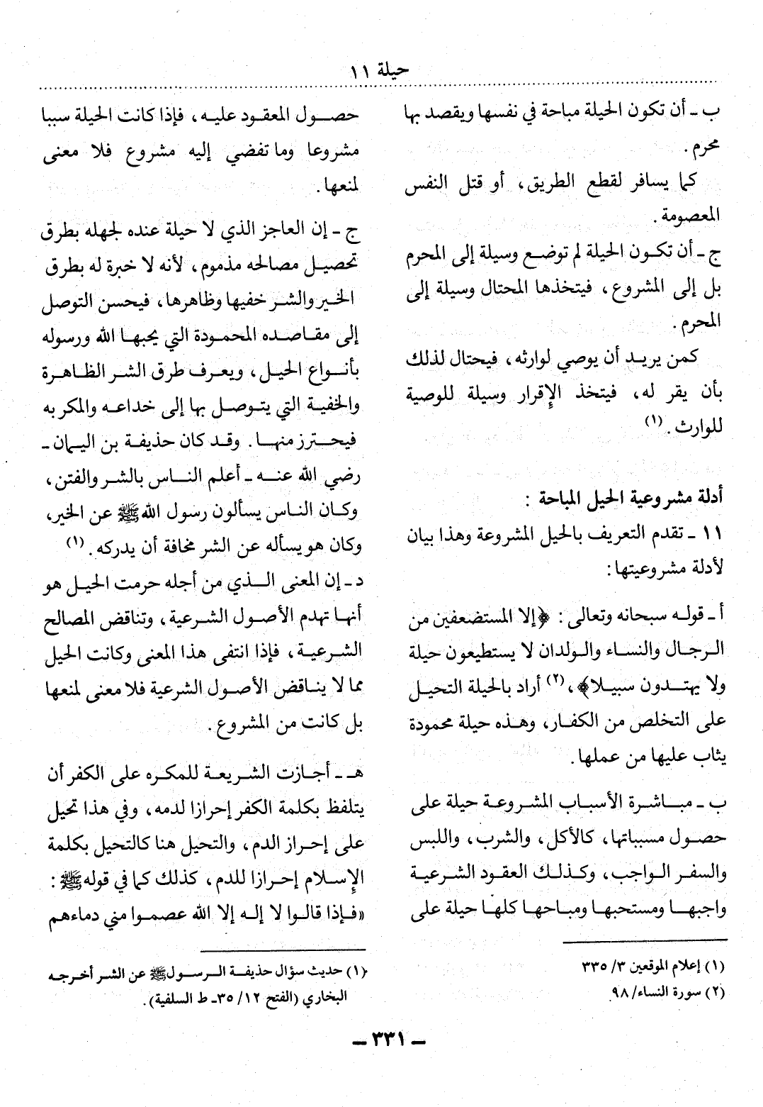 أ - قَوْلُهُ سُبْحَانَهُ وَتَعَالَى: {إِلاَّ الْمُسْتَضْعَفِينَ مِنَ الرِّجَال وَالنِّسَاءِ وَالْوِلْدَانِ لاَ يَسْتَطِيعُونَ حِيلَةً وَلاَ يَهْتَدُونَ سَبِيلاً} (2) ، أَرَادَ بِالْحِيلَةِ التَّحَيُّل عَلَى التَّخَلُّصِ مِنَ الْكُفَّارِ، وَهَذِهِ حِيلَةٌ مَحْمُودَةٌ يُثَابُ عَلَيْهَا مَنْ عَمِلَهَا.