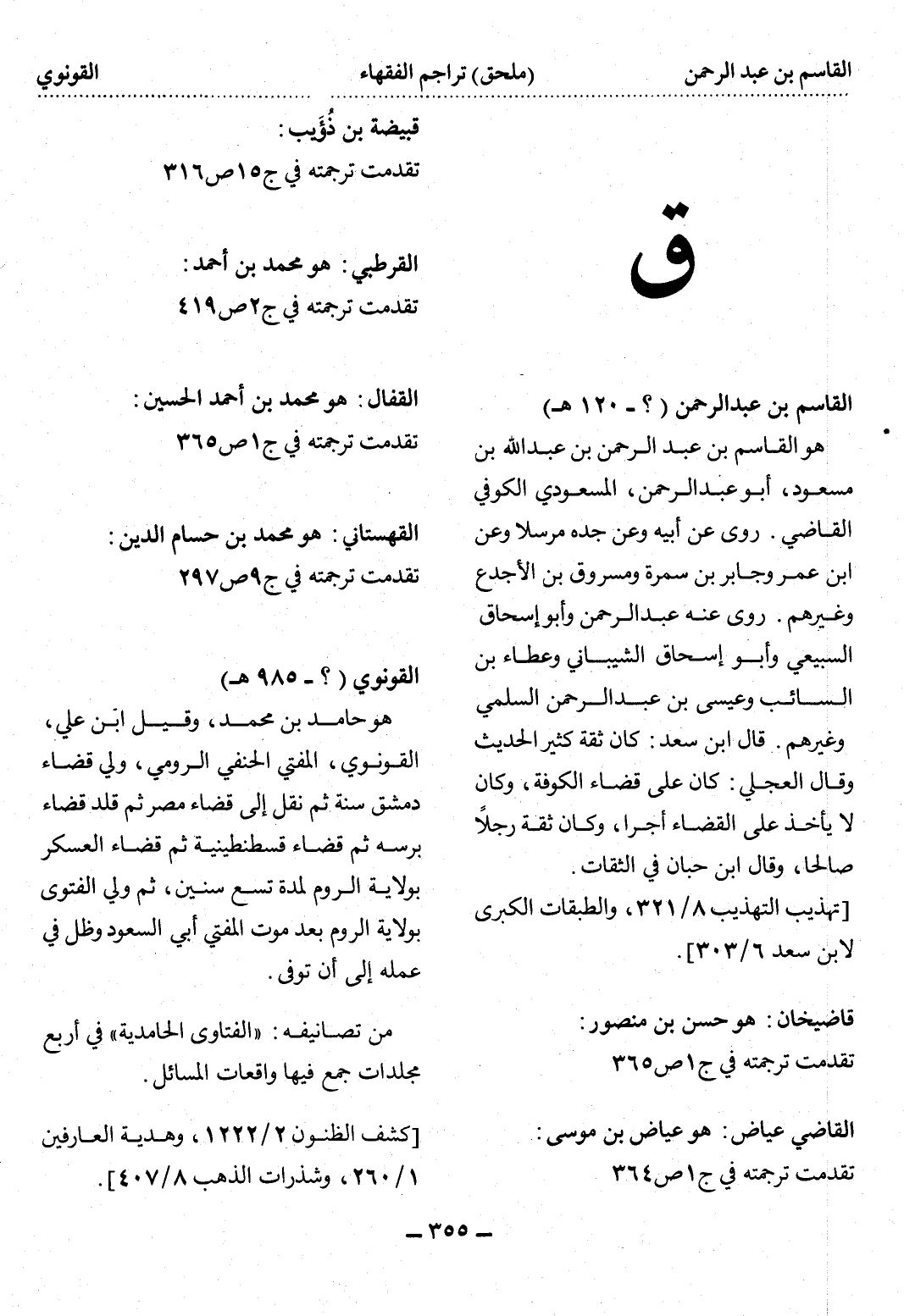 هو القاسم بن عبد الرحمن بن عبد الله بن مسعود، أبو عبد الرحمن، المسعودي الكوفي القاضي. روى عن أبيه وعن جده مرسلاً وعن ابن عمر وجابر بن سمرة ومسروق بن الأجدع وغيرهم. روى عنه عبد الرحمن وأبو إسحاق السبيعي وأبو إسحاق الشيباني وعطاء بن السائب وعيسى بن عبد الرحمن السلمي وغيرهم. قال ابن سعد: كان ثقة كثير الحديث وقال العجلي: كان على قضاء الكوفة، وكان لا يأخذ على القضاء أجراً، وكان ثقة رجلاً صالحاً، وقال ابن حبان في الثقات. [تهذيب التهذيب 8 / 321، والطبقات الكبرى لابن سعد 6 / 303] .
