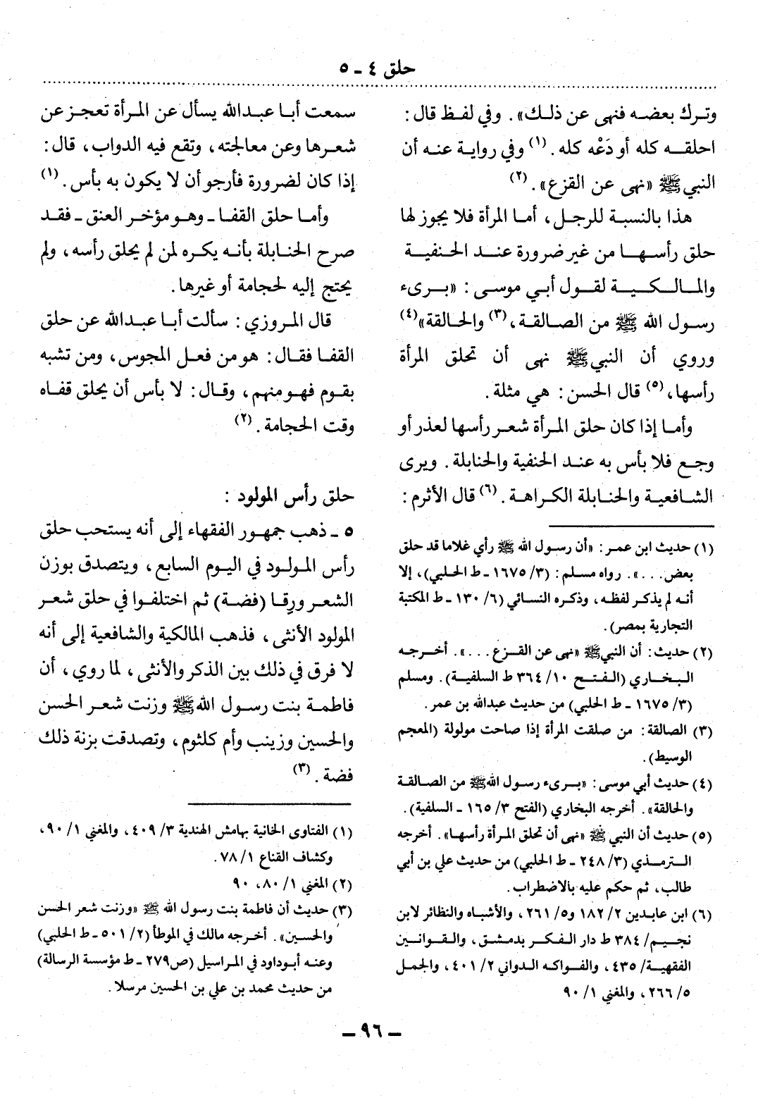 (1) حديث ابن عمر: " أن رسول الله صلى الله عليه وسلم رأى غلاما قد حلق بعض. . . " رواه مسلم: (3 / 1675 - ط الحلبي) ، إلا أنه لم يذكر لفظه، وذكره النسائي (6 / 130 - ط المكتبة التجارية بمصر) .