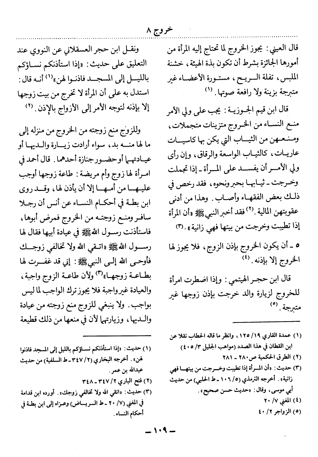 وَنَقَل ابْنُ حَجَرٍ الْعَسْقَلاَنِيُّ عَنِ النَّوَوِيِّ عِنْدَ التَّعْلِيقِ عَلَى حَدِيثِ: إِذَا اسْتَأْذَنَكُمْ نِسَاؤُكُمْ بِاللَّيْل إِلَى الْمَسْجِدِ فَأْذَنُوا لَهُنَّ (1) أَنَّهُ قَال: اسْتُدِل بِهِ عَلَى أَنَّ الْمَرْأَةَ لاَ تَخْرُجُ مِنْ بَيْتِ زَوْجِهَا إِلاَّ بِإِذْنِهِ لِتَوَجُّهِ الأَْمْرِ إِلَى الأَْزْوَاجِ بِالإِْذْنِ (2) .