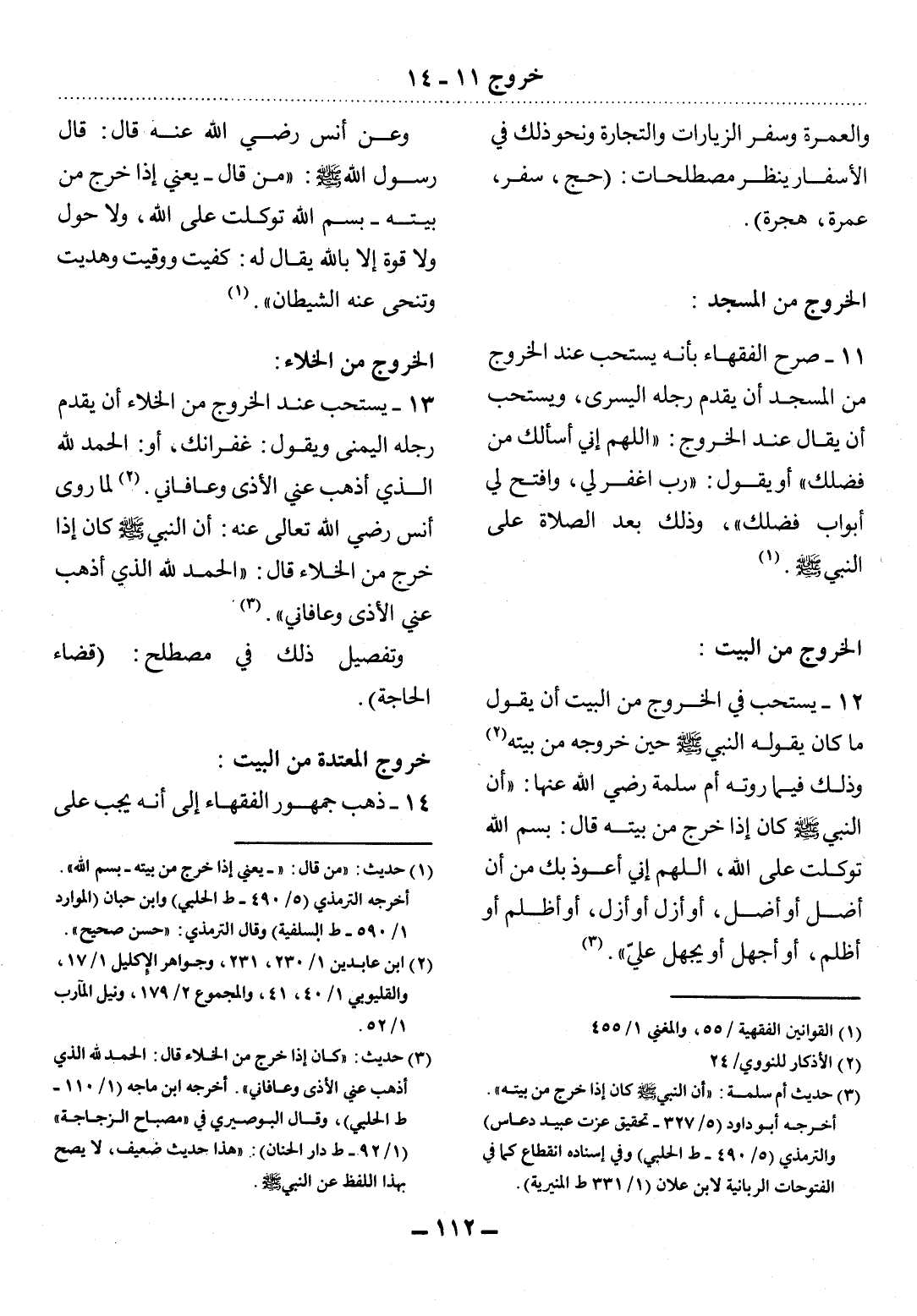 12 - يُسْتَحَبُّ فِي الْخُرُوجِ مِنَ الْبَيْتِ أَنْ يَقُول مَا كَانَ يَقُولُهُ النَّبِيُّ صَلَّى اللَّهُ عَلَيْهِ وَسَلَّمَ حِينَ خُرُوجِهِ مِنْ بَيْتِهِ (2) وَذَلِكَ فِيمَا رَوَتْهُ أُمُّ سَلَمَةَ رَضِيَ اللَّهُ عَنْهَا: أَنَّ النَّبِيَّ صَلَّى اللَّهُ عَلَيْهِ وَسَلَّمَ كَانَ إِذَا خَرَجَ مِنْ بَيْتِهِ قَال: بِسْمِ اللَّهِ تَوَكَّلْتُ عَلَى اللَّهِ، اللَّهُمَّ إِنِّي أَعُوذُ بِكَ مِنْ أَنْ أَضِل أَوْ أُضَل، أَوْ أَزِل أَوْ أُزَل، أَوْ أَظْلِمَ أَوْ أُظْلَمَ، أَوْ أَجْهَل أَوْ يُجْهَل عَلَيَّ. (3)