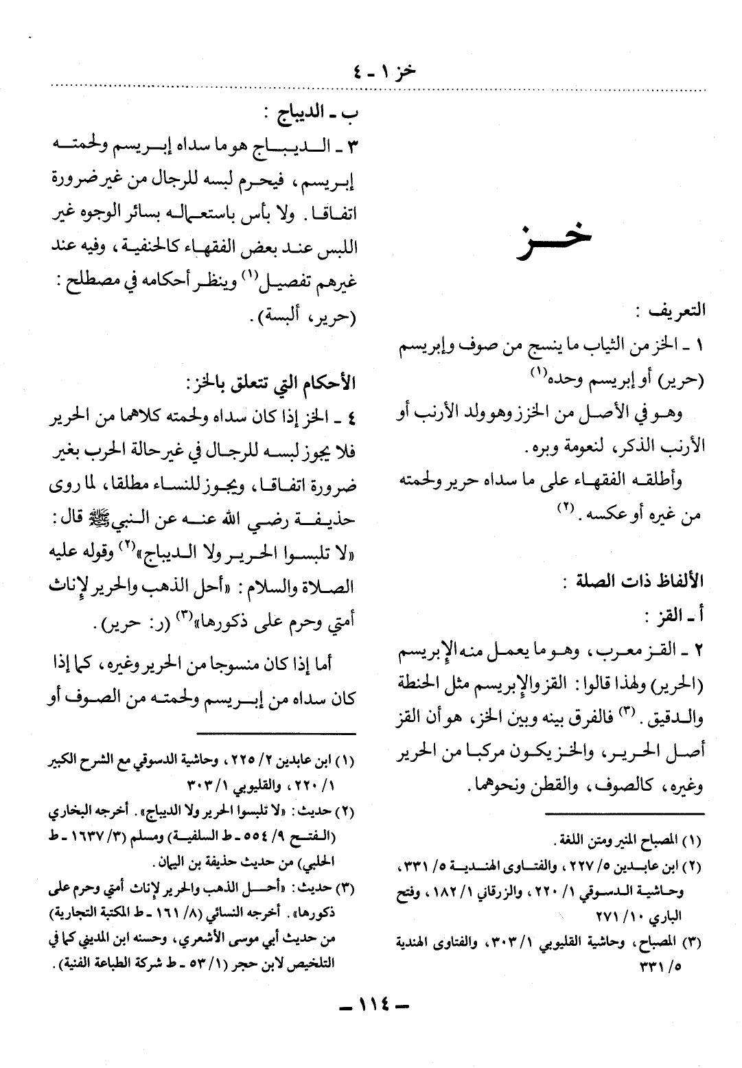 1 - الْخَزُّ مِنَ الثِّيَابِ مَا يُنْسَجُ مِنْ صُوفٍ وَإِبْرَيْسَمٍ (حَرِيرٍ) أَوْ إِبْرَيْسَمٍ وَحْدَهُ (1)