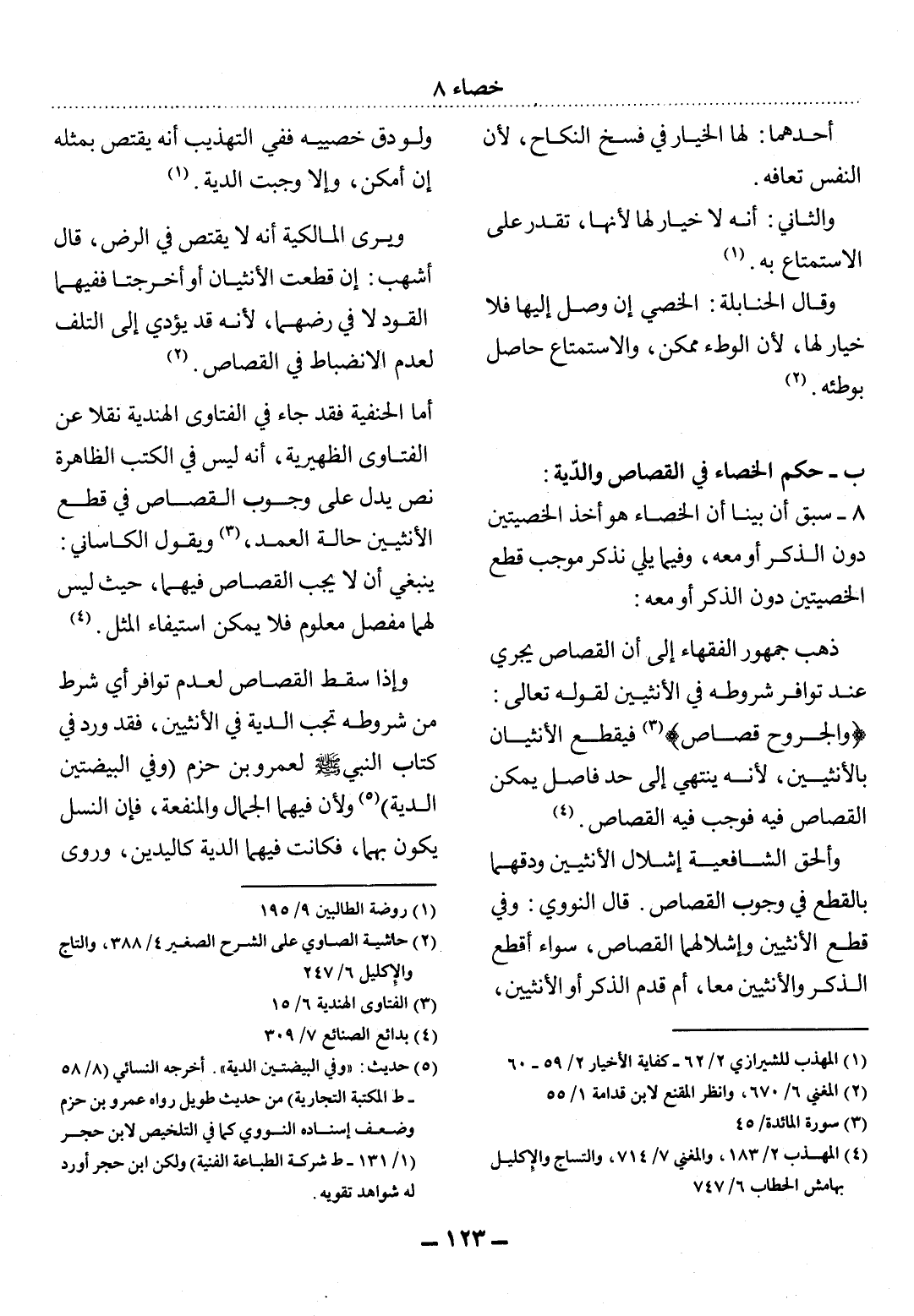 8 - سَبَقَ أَنْ بَيَّنَّا أَنَّ الْخِصَاءَ هُوَ أَخْذُ الْخُصْيَتَيْنِ دُونَ الذَّكَرِ أَوْ مَعَهُ، وَفِيمَا يَلِي نَذْكُرُ مُوجِبَ قَطْعِ الْخُصْيَتَيْنِ دُونَ الذَّكَرِ أَوْ مَعَهُ: