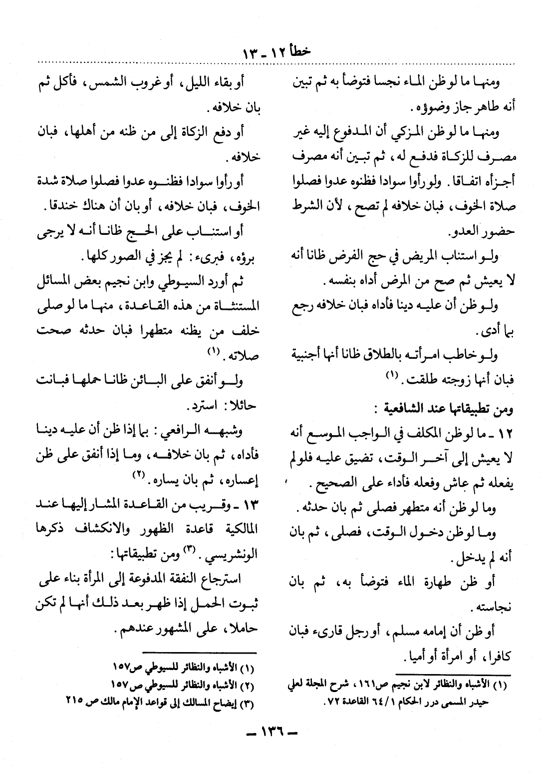 (1) الأشباه والنظائر لابن نجيم ص 161، شرح المجلة لعلي حيدر المسمى درر الحكام 1 / 64 القاعدة 72.