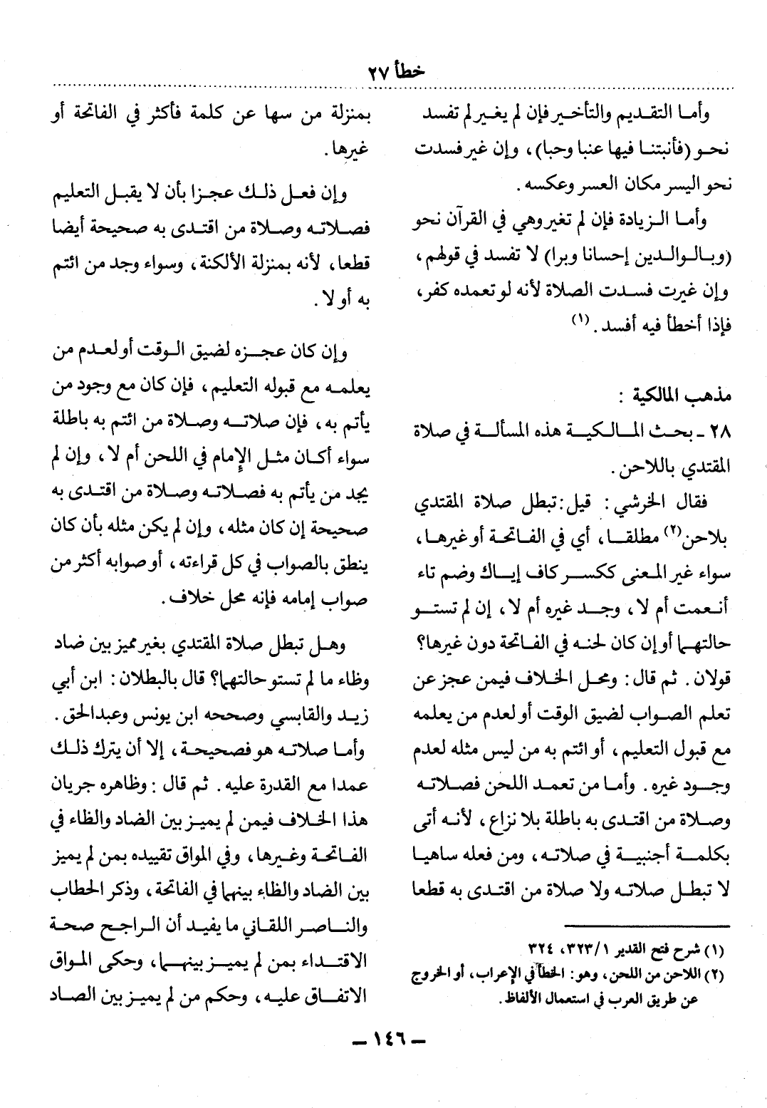 28 - بَحَثَ الْمَالِكِيَّةُ هَذِهِ الْمَسْأَلَةَ فِي صَلاَةِ الْمُقْتَدِي بِاللاَّحِنِ.