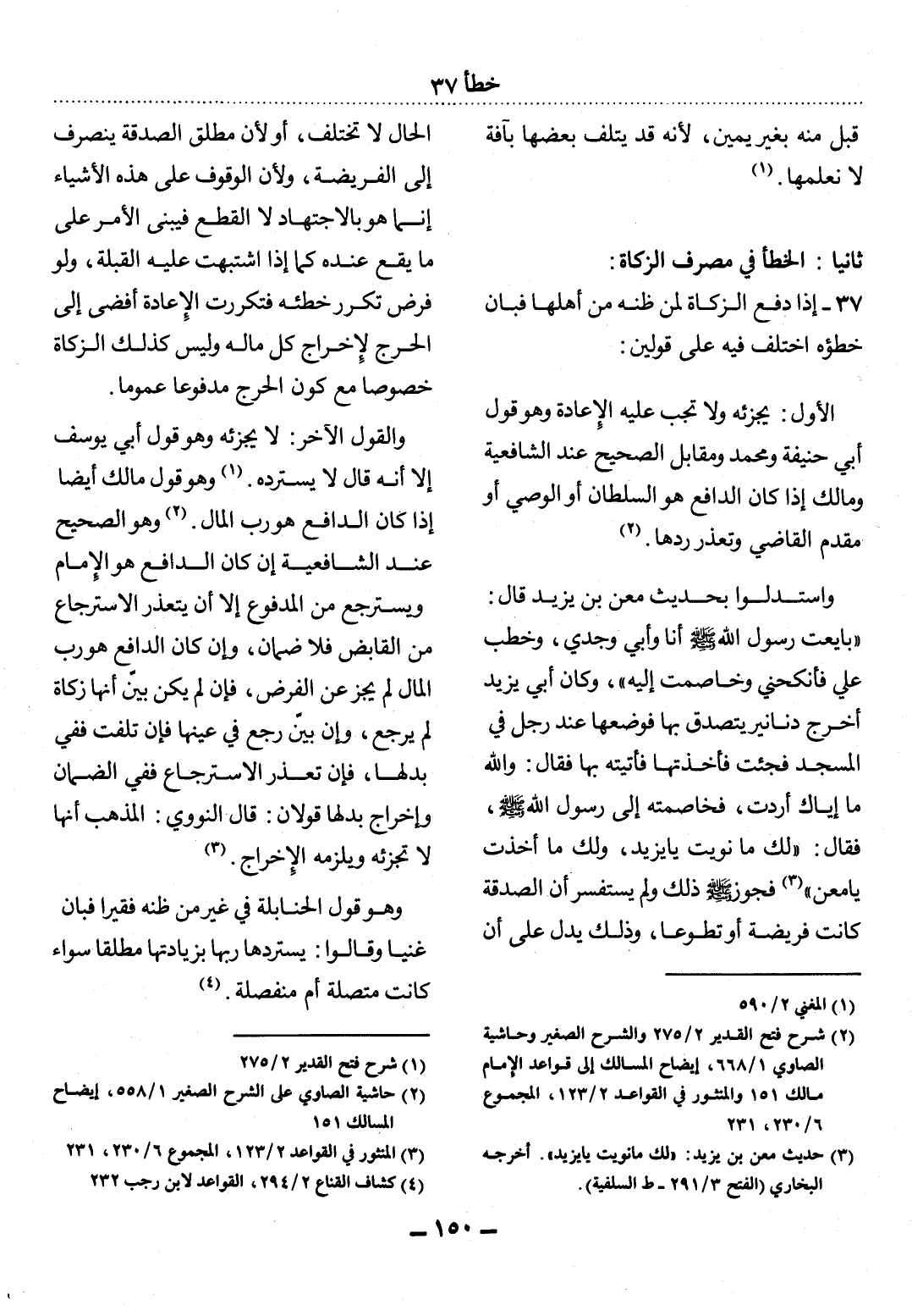 37 - إِذَا دَفَعَ الزَّكَاةَ لِمَنْ ظَنَّهُ مِنْ أَهْلِهَا فَبَانَ خَطَؤُهُ اخْتُلِفَ فِيهِ عَلَى قَوْلَيْنِ: