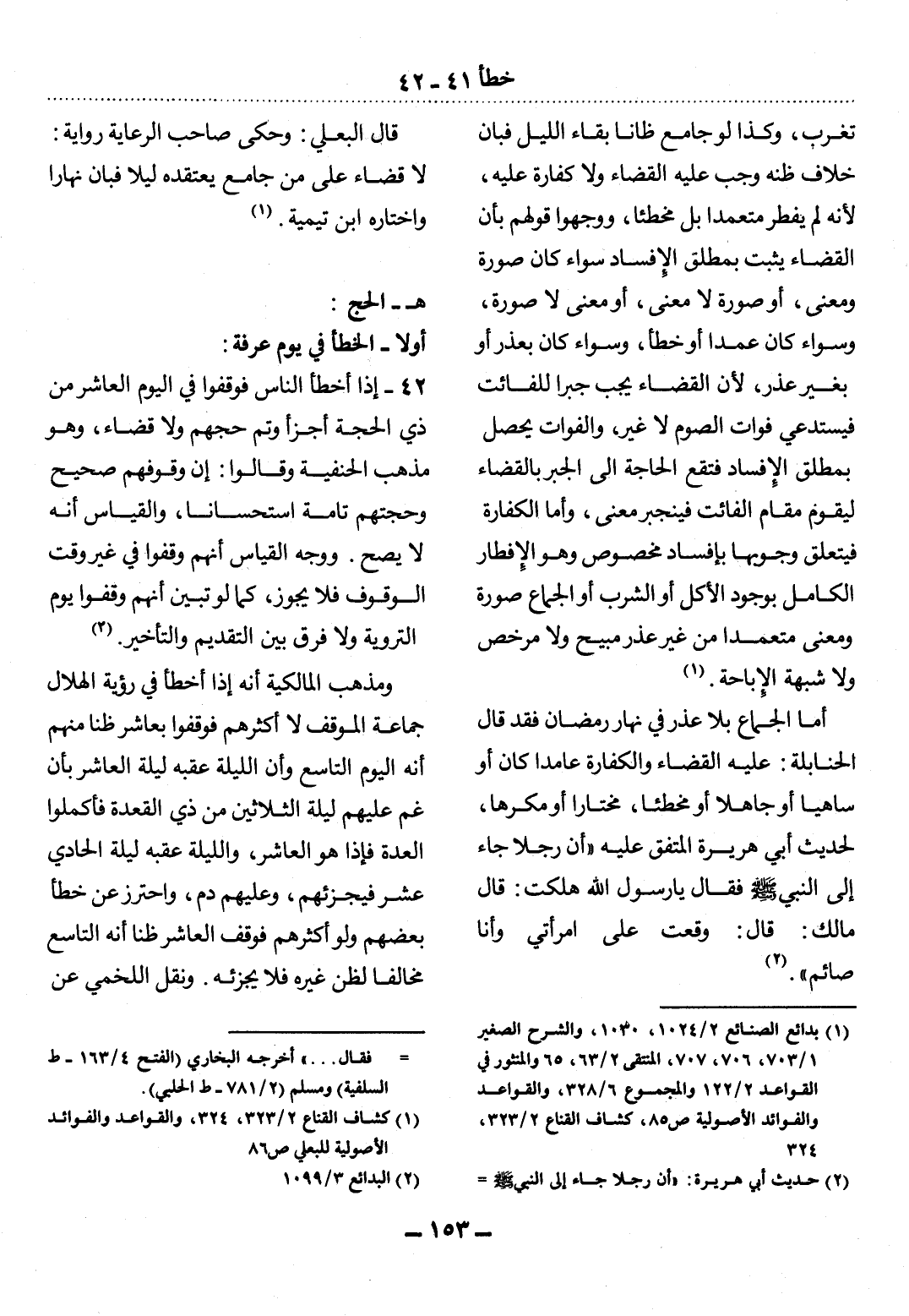42 - إِذَا أَخْطَأَ النَّاسُ فَوَقَفُوا فِي الْيَوْمِ الْعَاشِرِ مِنْ ذِي الْحِجَّةِ أَجْزَأَ وَتَمَّ حَجُّهُمْ وَلاَ قَضَاءَ، وَهُوَ مَذْهَبُ الْحَنَفِيَّةِ وَقَالُوا: إِنَّ وُقُوفَهُمْ صَحِيحٌ وَحَجَّتَهُمْ تَامَّةٌ اسْتِحْسَانًا، وَالْقِيَاسُ أَنَّهُ لاَ يَصِحُّ. وَوَجْهُ الْقِيَاسِ أَنَّهُمْ وَقَفُوا فِي غَيْرِ وَقْتِ الْوُقُوفِ فَلاَ يَجُوزُ، كَمَا لَوْ تَبَيَّنَ أَنَّهُمْ وَقَفُوا يَوْمَ التَّرْوِيَةِ وَلاَ فَرْقَ بَيْنَ التَّقْدِيمِ وَالتَّأْخِيرِ (2) .
