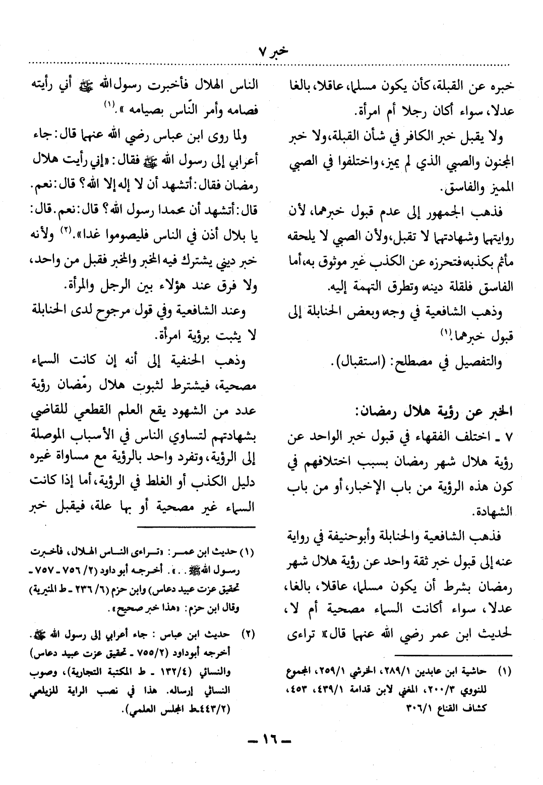وَلِمَا رَوَى ابْنُ عَبَّاسٍ رَضِيَ اللَّهُ عَنْهُمَا قَال: جَاءَ أَعْرَابِيٌّ إِلَى رَسُول اللَّهِ صَلَّى اللَّهُ عَلَيْهِ وَسَلَّمَ فَقَال: إِنِّي رَأَيْتُ هِلاَل رَمَضَانَ فَقَال: أَتَشْهَدُ أَنْ لاَ إِلَهَ إِلاَّ اللَّهُ؟ قَال: نَعَمْ. قَال: أَتَشْهَدُ أَنَّ مُحَمَّدًا رَسُول اللَّهِ؟ قَال: نَعَمْ قَال: يَا بِلاَل أَذِّنْ فِي النَّاسِ فَلْيَصُومُوا غَدًا (2) وَلأَِنَّهُ خَبَرٌ دِينِيٌّ يَشْتَرِكُ فِيهِ الْمُخْبِرُ وَالْمُخْبَرُ فَقُبِل مِنْ وَاحِدٍ، وَلاَ فَرْقَ عِنْدَ هَؤُلاَءِ بَيْنَ الرَّجُل وَالْمَرْأَةِ.