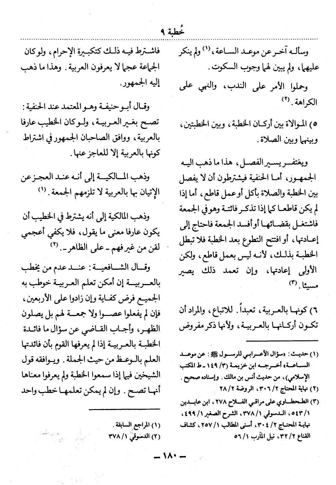 وَذَهَبَ الْمَالِكِيَّةُ إِلَى أَنَّهُ يُشْتَرَطُ فِي الْخَطِيبِ أَنْ يَكُونَ عَارِفًا مَعْنَى مَا يَقُول، فَلاَ يَكْفِي أَعْجَمِيٌّ لُقِّنَ مِنْ غَيْرِ فَهْمٍ - عَلَى الظَّاهِرِ - (2)