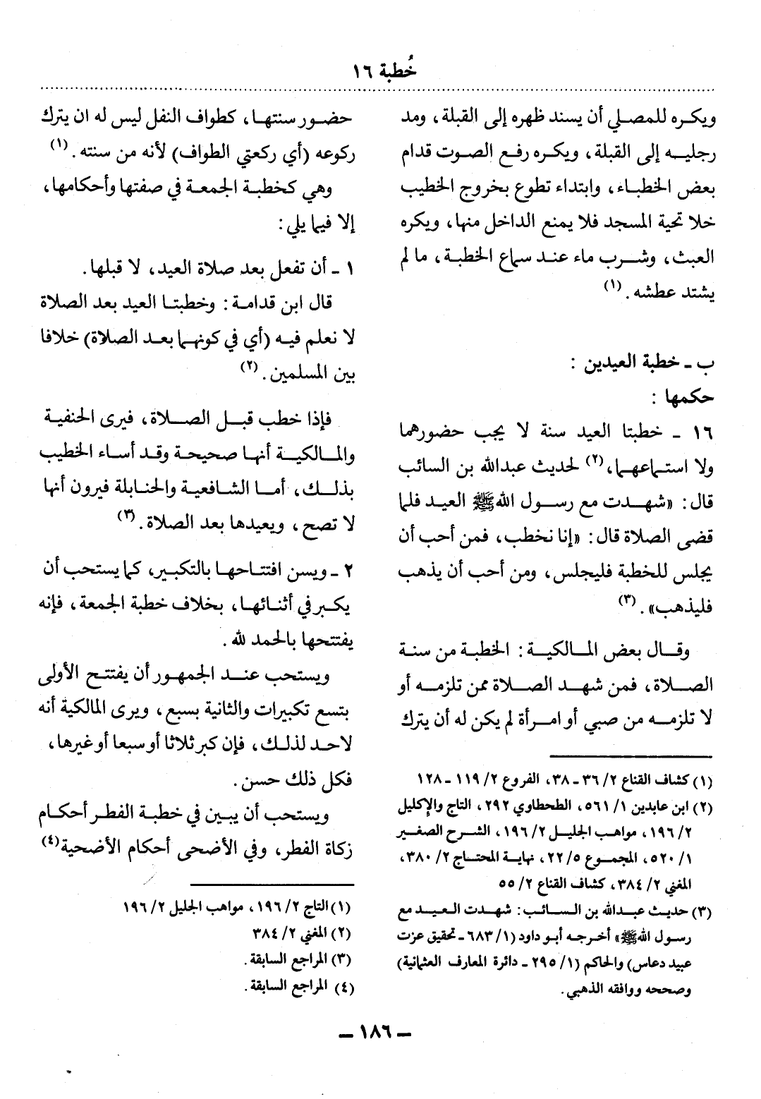16 - خُطْبَتَا الْعِيدِ سُنَّةٌ لاَ يَجِبُ حُضُورُهُمَا وَلاَ اسْتِمَاعُهُمَا، (2) لِحَدِيثِ عَبْدِ اللَّهِ بْنِ السَّائِبِ قَال: شَهِدْتُ مَعَ رَسُول اللَّهِ صَلَّى اللَّهُ عَلَيْهِ وَسَلَّمَ الْعِيدَ فَلَمَّا قَضَى الصَّلاَةَ قَال: إِنَّا نَخْطُبُ، فَمَنْ أَحَبَّ أَنْ يَجْلِسَ لِلْخُطْبَةِ فَلْيَجْلِسْ، وَمَنْ أَحَبَّ أَنْ يَذْهَبَ فَلْيَذْهَبْ. (3)
