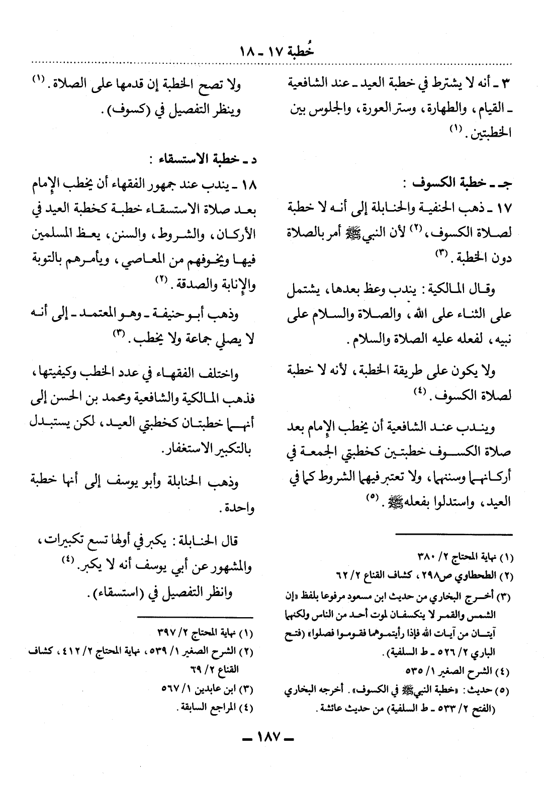 17 - ذَهَبَ الْحَنَفِيَّةُ وَالْحَنَابِلَةُ إِلَى أَنَّهُ لاَ خُطْبَةَ لِصَلاَةِ الْكُسُوفِ (2) ، لأَِنَّ النَّبِيَّ صَلَّى اللَّهُ عَلَيْهِ وَسَلَّمَ أَمَرَ بِالصَّلاَةِ دُونَ الْخُطْبَةِ. (3)