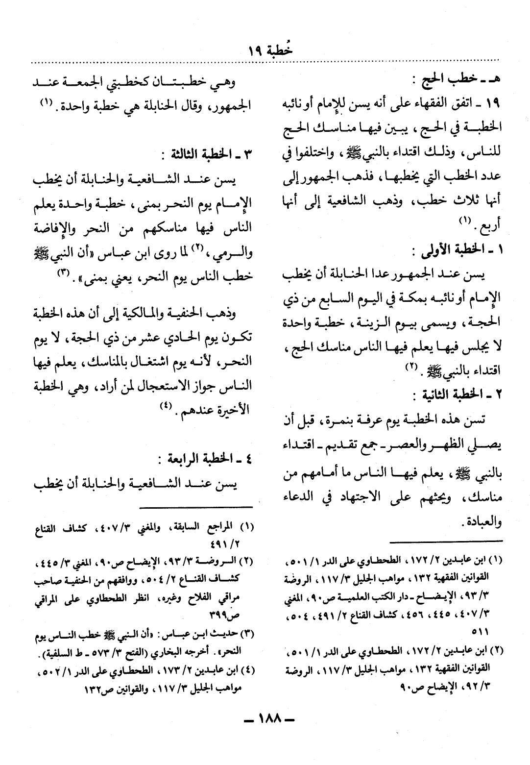 19 - اتَّفَقَ الْفُقَهَاءُ عَلَى أَنَّهُ يُسَنُّ لِلإِْمَامِ أَوْ نَائِبِهِ الْخُطْبَةُ فِي الْحَجِّ، يُبَيِّنُ فِيهَا مَنَاسِكَ الْحَجِّ لِلنَّاسِ، وَذَلِكَ اقْتِدَاءٌ بِالنَّبِيِّ صَلَّى اللَّهُ عَلَيْهِ وَسَلَّمَ وَاخْتَلَفُوا فِي عَدَدِ الْخُطَبِ الَّتِي يَخْطُبُهَا، فَذَهَبَ الْجُمْهُورُ إِلَى أَنَّهَا ثَلاَثُ خُطَبٍ، وَذَهَبَ الشَّافِعِيَّةُ إِلَى أَنَّهَا أَرْبَعٌ. (1)