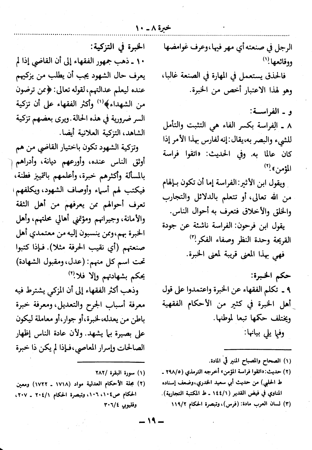 9 - تَكَلَّمَ الْفُقَهَاءُ عَنِ الْخِبْرَةِ وَاعْتَمَدُوا عَلَى قَوْل أَهْل الْخِبْرَةِ فِي كَثِيرٍ مِنَ الأَْحْكَامِ الْفِقْهِيَّةِ وَيَخْتَلِفُ حُكْمُهَا تَبَعًا لِمَوْطِنِهَا.
