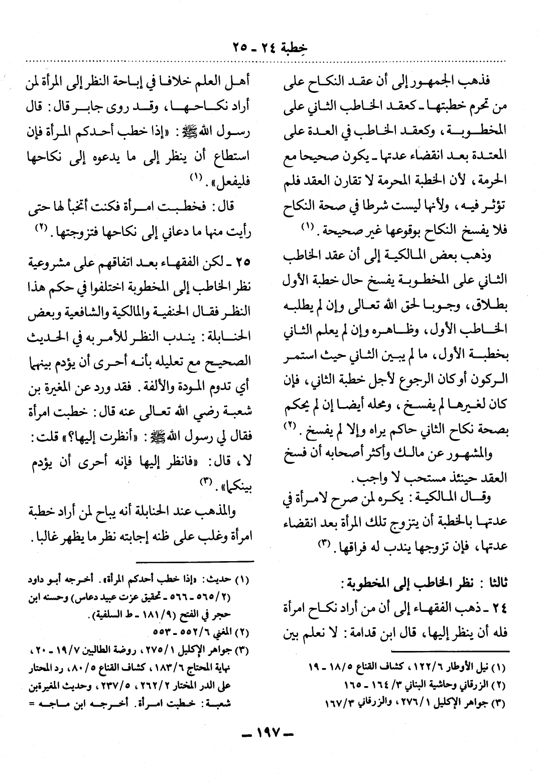 (3) جواهر الإكليل 1 / 275، روضة الطالبين 7 / 19 - 20، نهاية المحتاج 6 / 183، كشاف القناع 5 / 80، رد المحتار على الدر المختار 2 / 262، 5 / 237، وحديث المغيرة بن شعبة: خطبت امرأة. أخرجه ابن ماجه (1 / 600 - ط الحلبي) وأحمد (4 / 246 - ط الميمنية) واللفظ له، وقال البوصيري في " مصباح الزجاجة " (1 / 328 - ط دار الحنان) : " إسناده صحيح ".